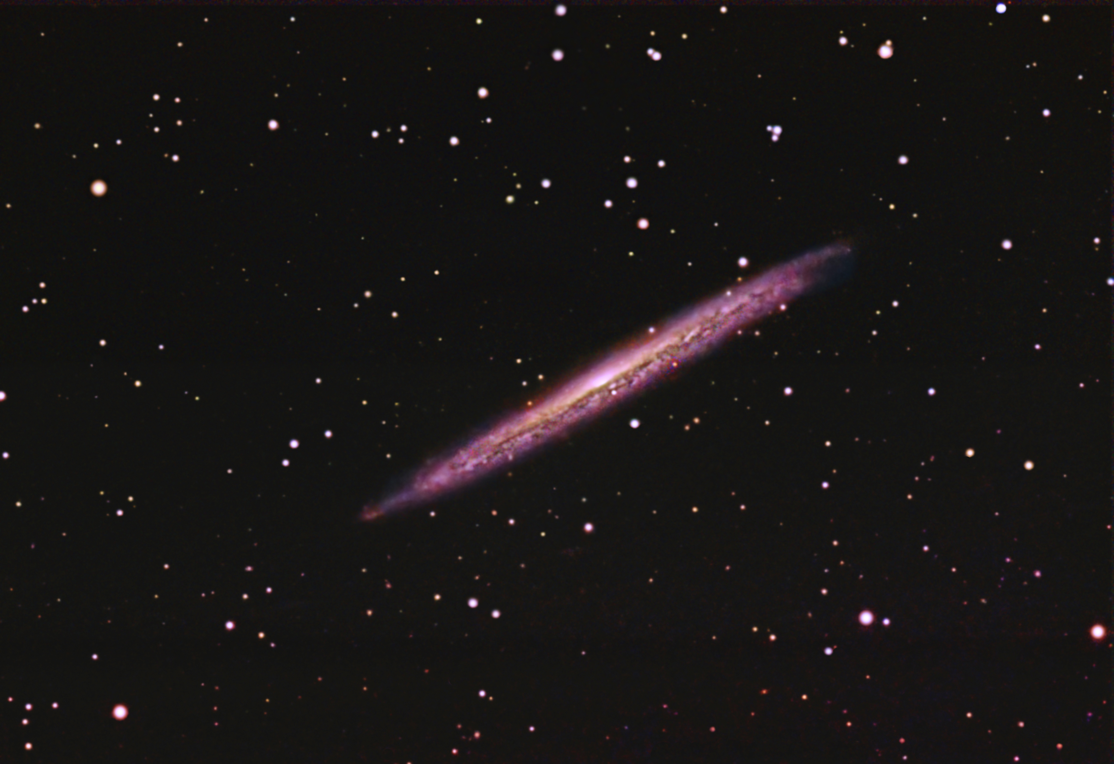 NGC 5906 wird wegen ihrer Form auch Messerschneiden-Galaxie genannt. An einem warmen Sommerabend stand sie bei uns in Norddeutschland bereits im Westen, aber noch in ausreichender Höhe, um sie mit entsprechender Belichtungszeit aufzunehmen.
