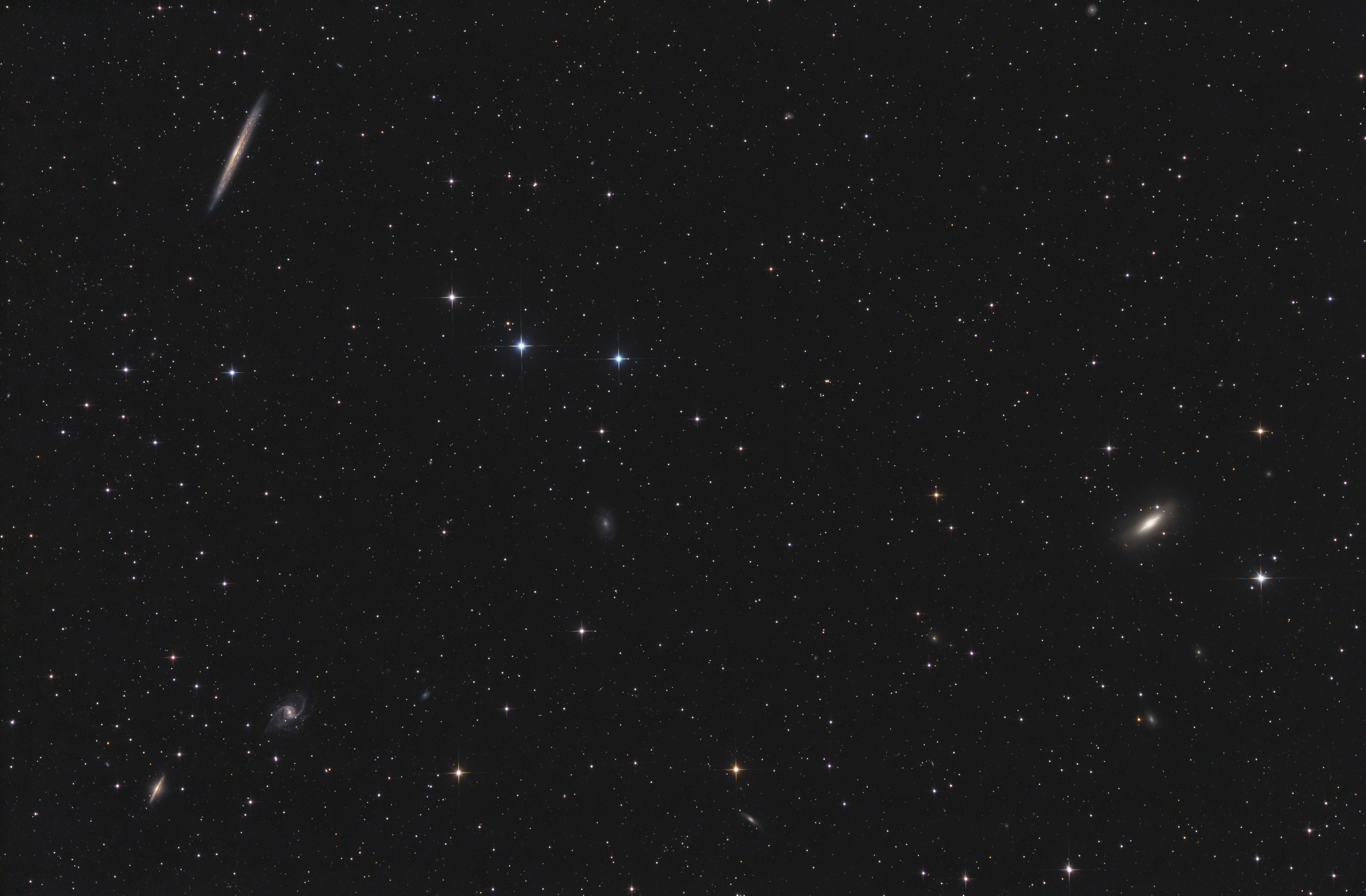 Im Sternbild Drache befindet sich eine Gruppe von Galaxien mit sehr unterschiedlichen Formen. Die deutlichste Spindelgestalt zeigt dabei NGC 5907. Aus dem Katalog von Charles Messier stammt die Galaxie M 102, rechts im Bild.