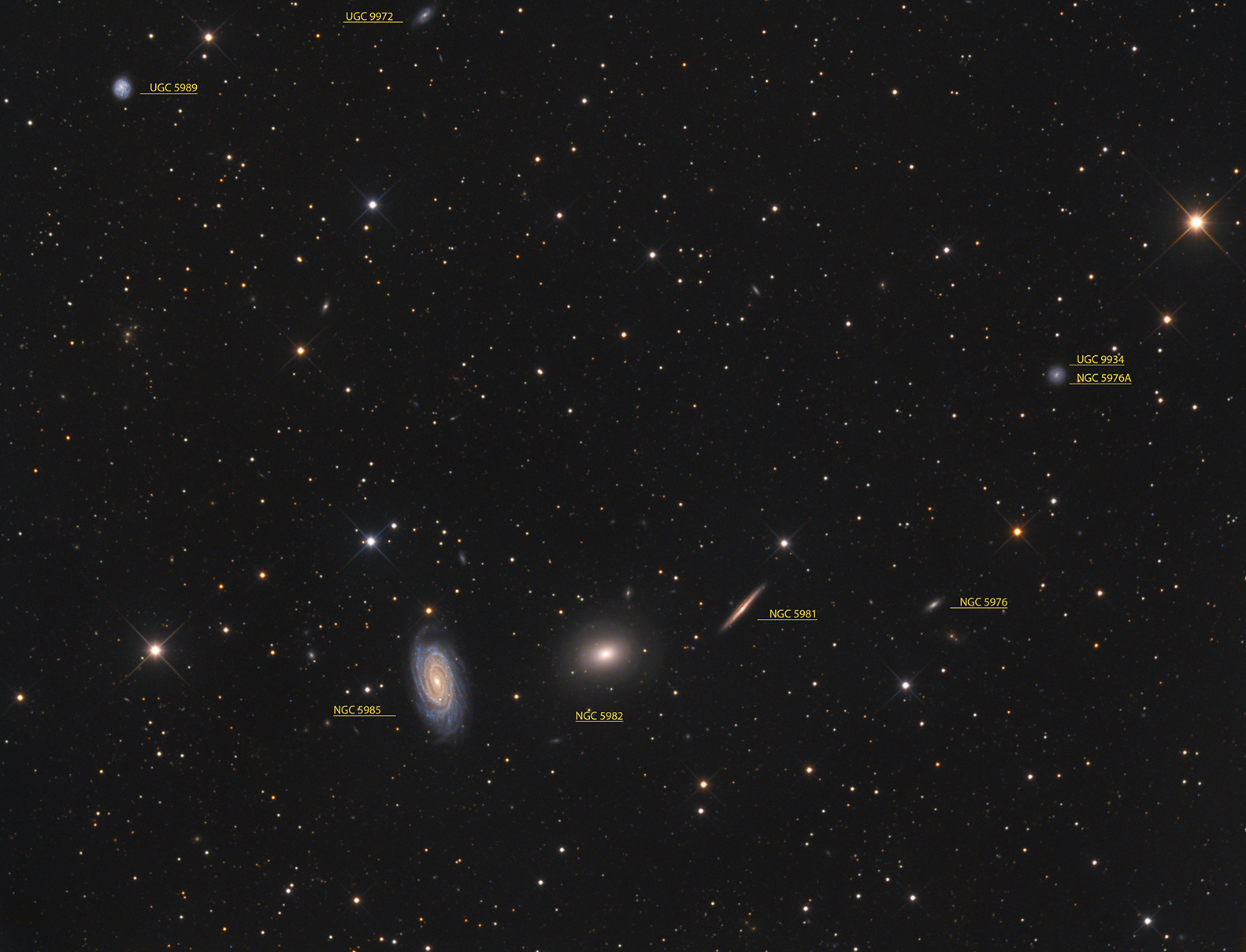 NGC 5982 ist eine elliptische Galaxie mit aktivem Galaxienkern vom Hubble-Typ E3. Sie ist etwa 140 Millionen Lichtjahre von uns entfernt und hat einen Durchmesser von ca. 110000 Lichtjahren. Sie ist das hellste Mitglied der NGC 5982-Gruppe, zu der auch NGC 5976, NGC 5981, NGC 5985, NGC 5987 und NGC 5989 gehören. NGC 5981 ist eine helle Spiralgalaxie vom Hubble-Typ Sc. Sie ist etwa 86 Millionen Lichtjahre entfernt und hat einen Durchmesser von 65000 Lichtjahren. NGC 5985 ist eine Balkenspiralgalaxie mit aktivem Kern vom Hubble-Typ SBb. Ihre Entfernung beträgt etwa 120 Millionen Lichtjahre, ihr Durchmesser ca. 190000 Lichtjahre. Obwohl die drei Galaxien in ähnlicher Entfernung liegen, scheinen sie nicht in Wechselwirkung zu stehen.