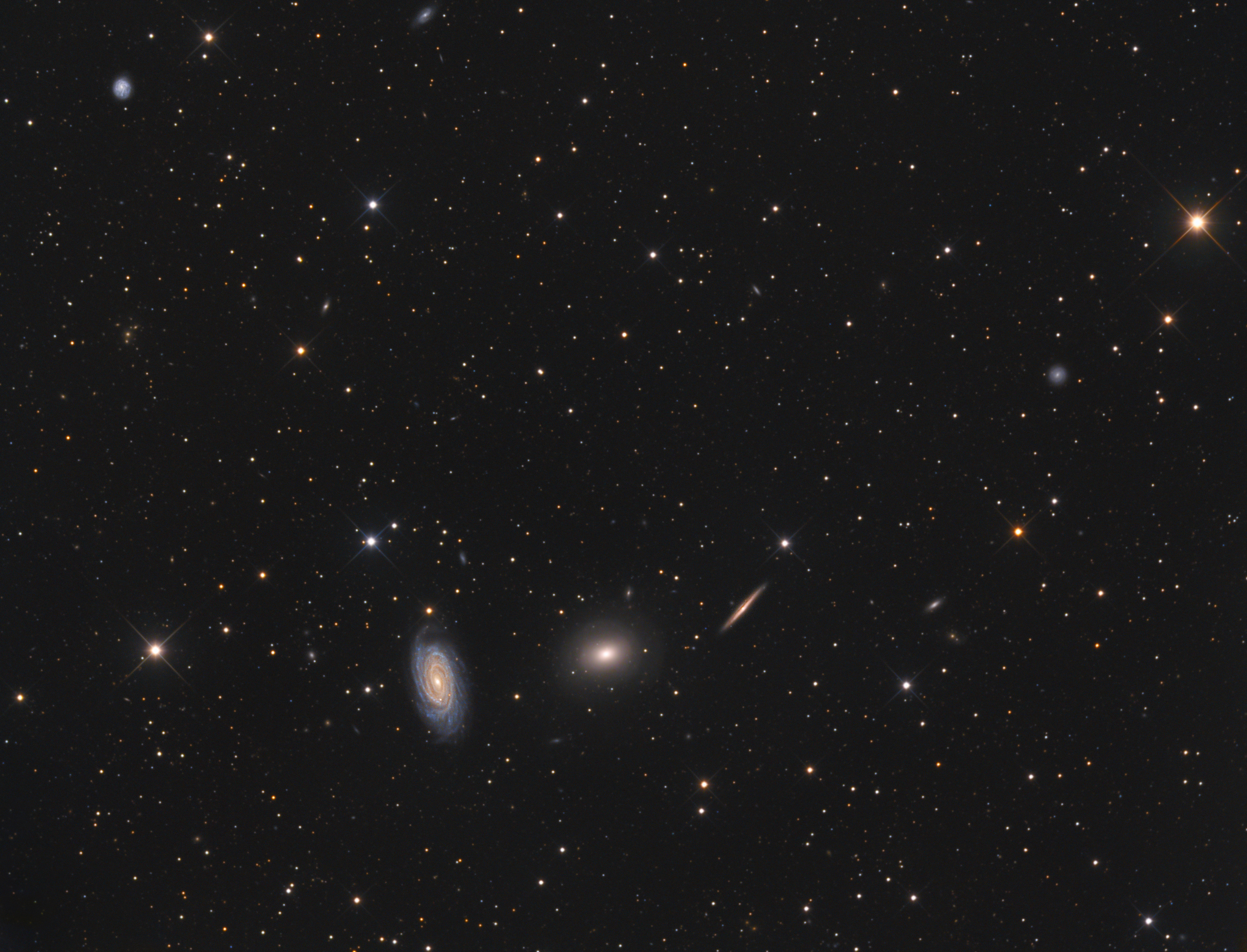 NGC 5982 ist eine elliptische Galaxie mit aktivem Galaxienkern vom Hubble-Typ E3. Sie ist etwa 140 Millionen Lichtjahre von uns entfernt und hat einen Durchmesser von ca. 110000 Lichtjahren. Sie ist das hellste Mitglied der NGC 5982-Gruppe, zu der auch NGC 5976, NGC 5981, NGC 5985, NGC 5987 und NGC 5989 gehören. NGC 5981 ist eine helle Spiralgalaxie vom Hubble-Typ Sc. Sie ist etwa 86 Millionen Lichtjahre entfernt und hat einen Durchmesser von 65000 Lichtjahren. NGC 5985 ist eine Balkenspiralgalaxie mit aktivem Kern vom Hubble-Typ SBb. Ihre Entfernung beträgt etwa 120 Millionen Lichtjahre, ihr Durchmesser ca. 190000 Lichtjahre. Obwohl die drei Galaxien in ähnlicher Entfernung liegen, scheinen sie nicht in Wechselwirkung zu stehen.