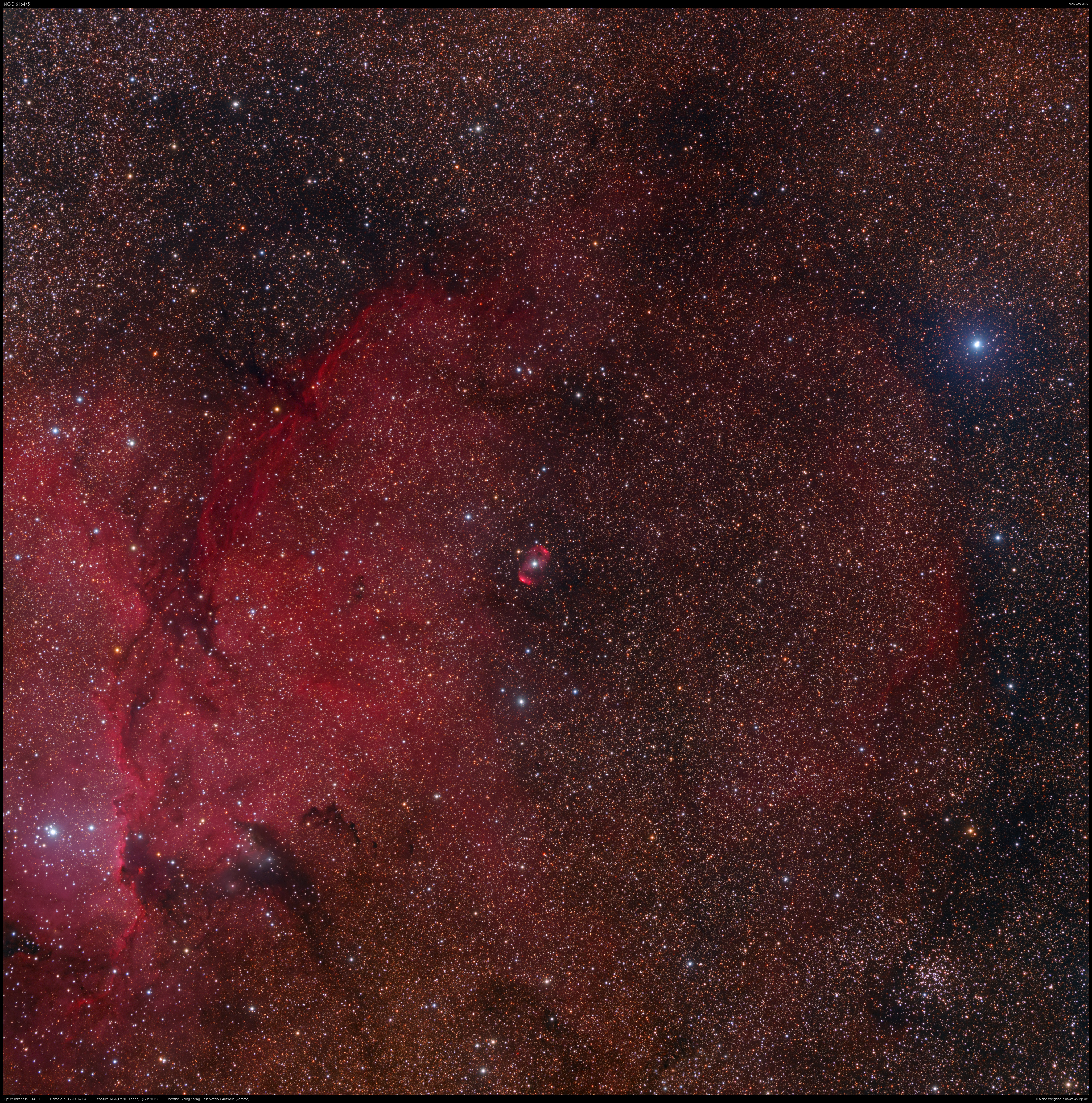 NGC 6164 ist ein kompakter bipolarer Nebel im Sternbild Altar (Ara) am Südhimmel. Ursprung ist der in dessen Zentrum zu erkennende sehr massereiche O-Stern HD 148937 (ca. 40 Sonnenmassen). Vermutlich verliert der Stern aufgrund sehr schneller Rotation einen Teil seiner Masse. Im unteren linken Quadranten sieht man zudem NGC 6193, einen offenen Sternhaufen. Die rund 27 jungen, 4.000 Lichtjahre entfernten Sterne sind Teil der Ara OB1 Assoziation und von der ausgedehnten HII-Region NGC 6188 umgeben. http://www.skytrip.de