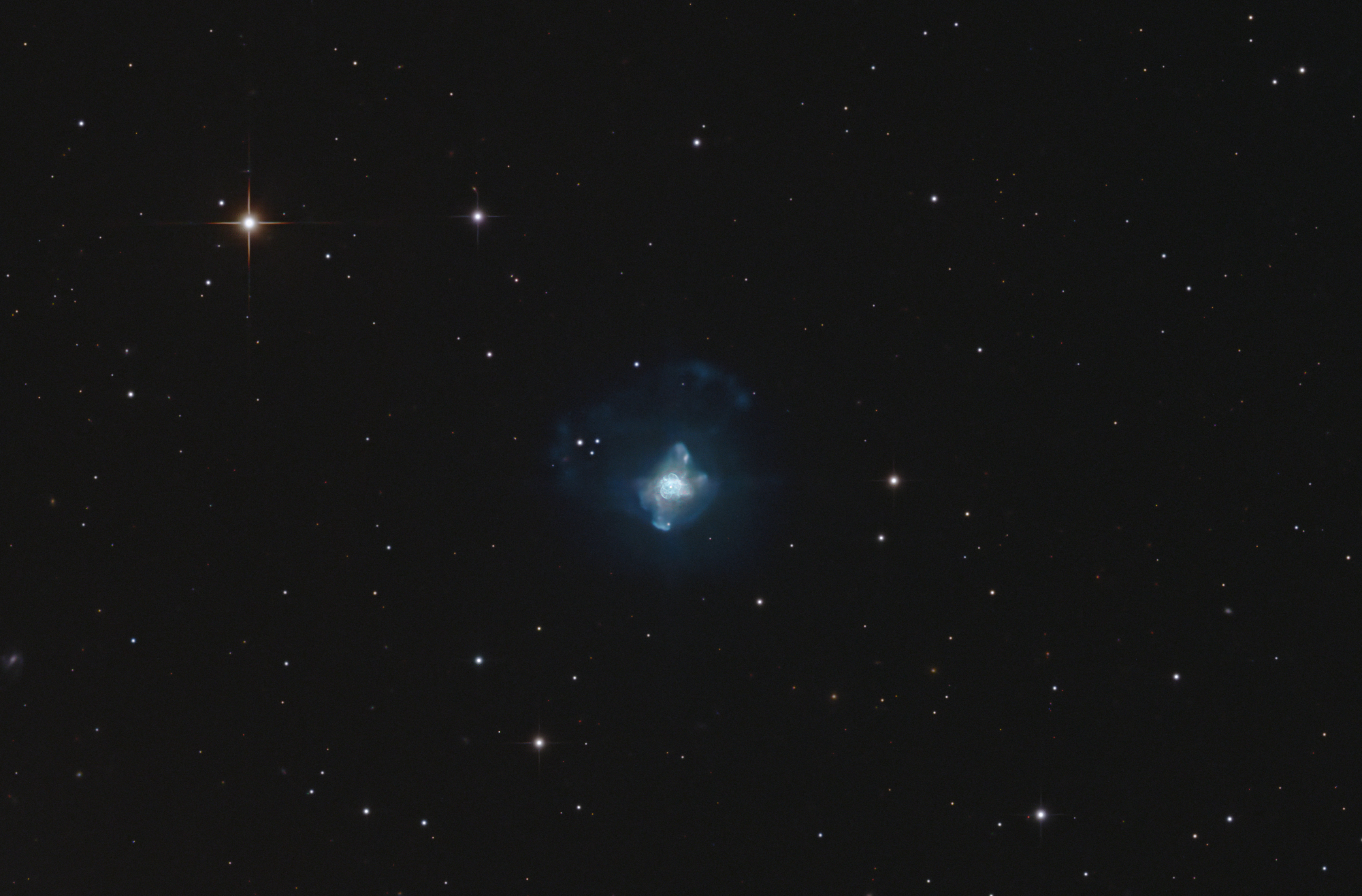 Im Zentrum befindet sich ein heißer Zentralstern (ein Weißer Zwerg in Bildung), der das abgestoßene Gas zum Leuchten bringt. Auffällig sind strahlenförmige Gasjets, die aus dem Zentralbereich herauszuwachsen scheinen. Die Bilddaten des Zentrums wurden mit Lucky Imaging gewonnen.