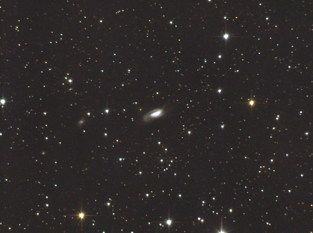 Durch Zufall stieß ich auf diese kleine, sehr einsam gelegene Galaxie 6.5 Grad nördlich von M13. Bei 12,1 mag ist sie nur 2,4 x 1,1 Bogenminuten klein und weitgehend unbekannt. Dennoch hat sich das Hubble Space Telescope ihrer angenommen wegen ihres besonderen Aussehens. Ihr Körper ist deformiert, so dass der südöstliche Teil stark diffus verbreitert ist, der nördwestliche aber 2(oder 3?) lange antennenförmige Extensionen aufweist. In Zentrumsnähe sieht man mehrere knotenartige Verdichtungen, die auf stattgefundenen galaktischen Kannibalismus mit aufflammender Sternentstehung (starbursts) hinweisen. Eine interagierende Verbindung mit der östlich davon gelegenen kleinen PGC Galaxie (ebenfalls 2 Kerne!) wird eher ausgeschlossen. Obwohl das Teleskop in Westlage betrieben wird und das Objekt am Westhimmel immer tiefer sank, habe ich 6,5 h an Belichtungszeit sammeln können.
