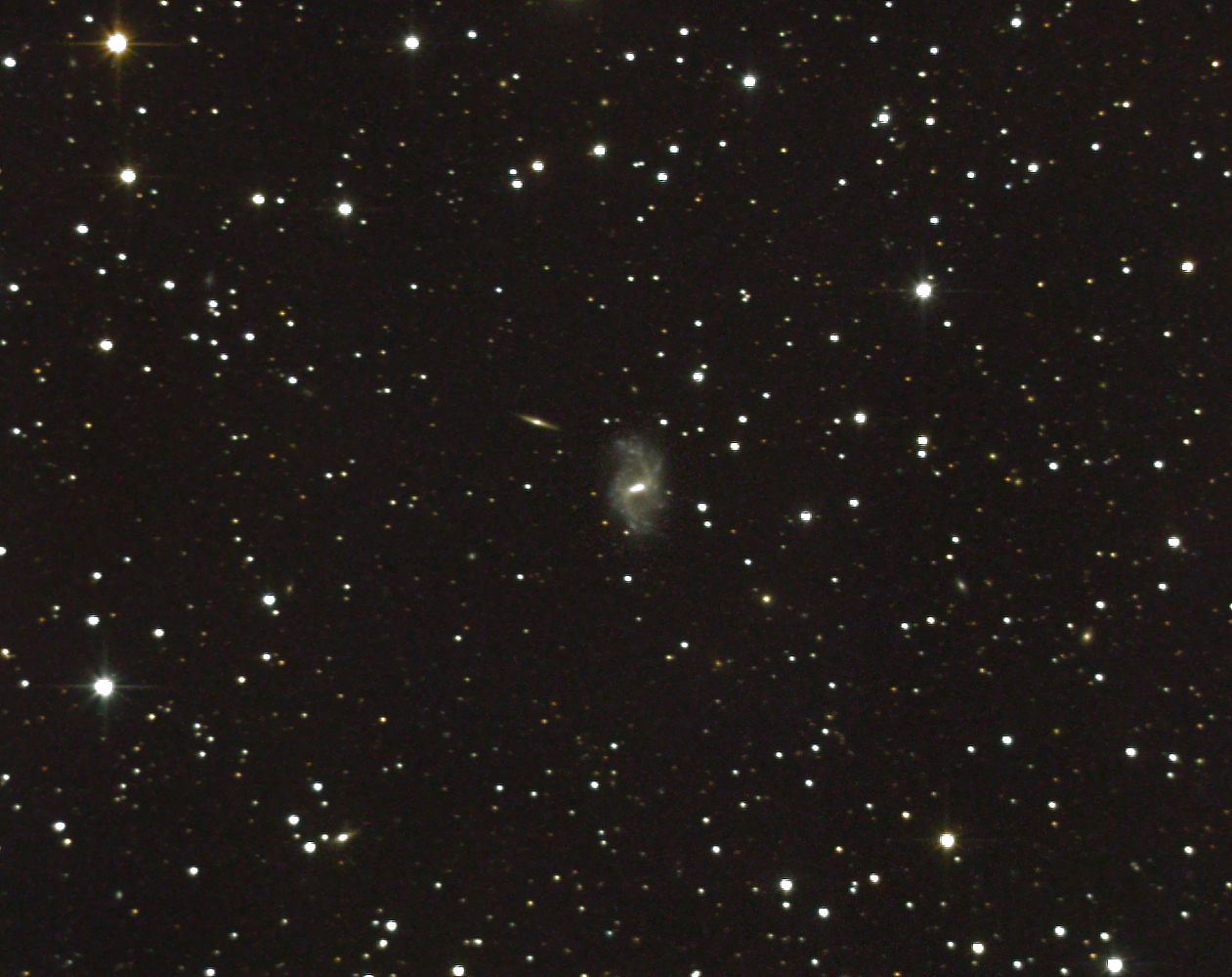NGC 6339, zwei Grad südlich des Kugelsternhaufens M92, (12,7 mag, Typ SBbc, 2,9 x 1 7 Bogenminuten) ist eine der hellsten Galaxien im Sternbild Herkules und ungefähr 102 Millionen Lichtjahre entfernt. Die edge-on-Galaxie PGC 60007 (16,1 mag) liegt weit im Hintergrund (Entfernung 750 Millionen Lichtjahre). Entdeckt hat sie Lewis Swift im April 1887. Bereits 2019 hatte ich diese Galaxie aufgenommen, nun konnte ich noch weitere zwei Stunden Belichtungszeit hinzufügen.