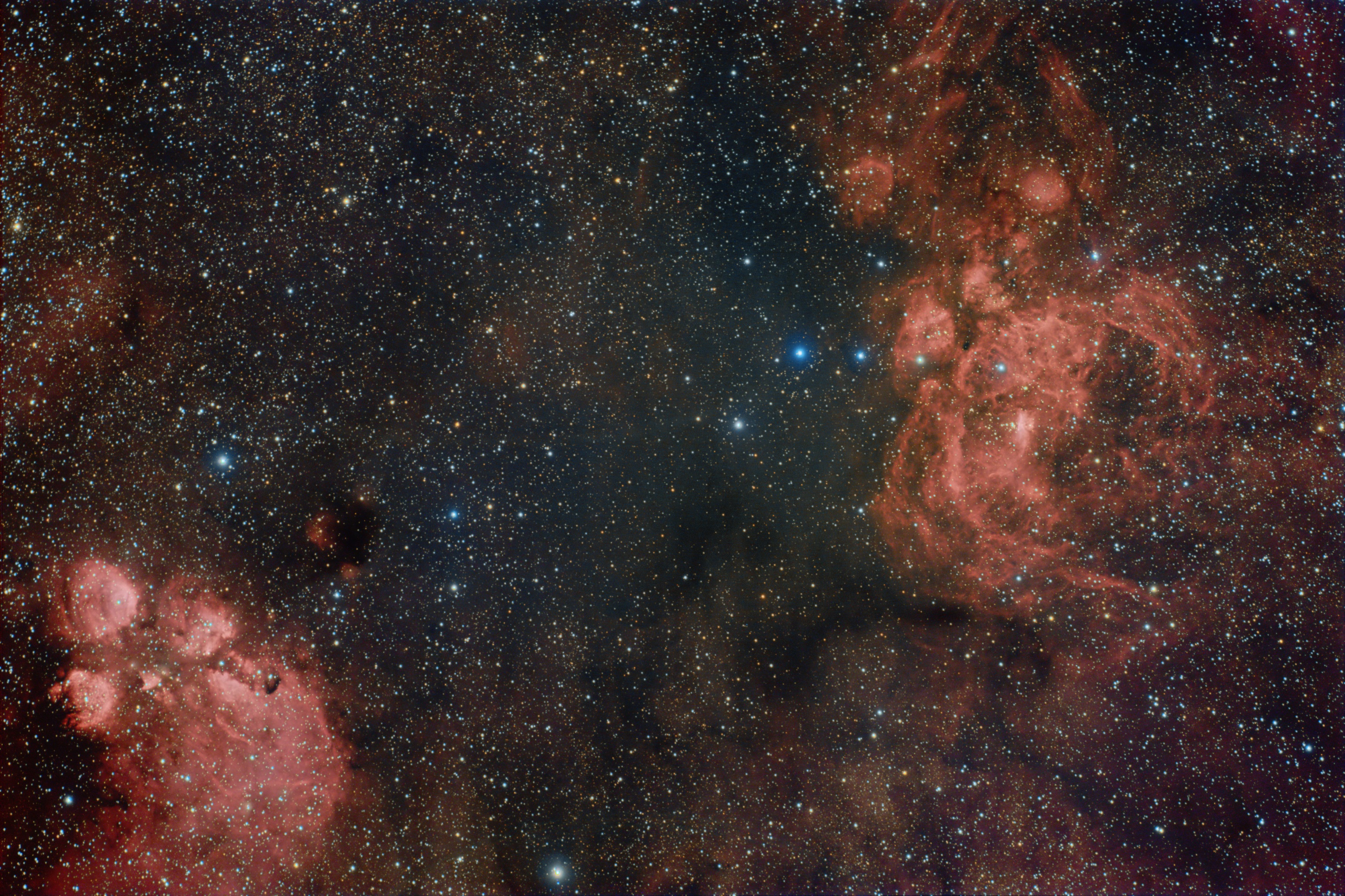 Ist der Emissionsnebel NGC 6357 (rechts) der Hüter der Katzenpfote (NGC 6334, links) oder stürzt er sich mit Geschrei auf diese?
