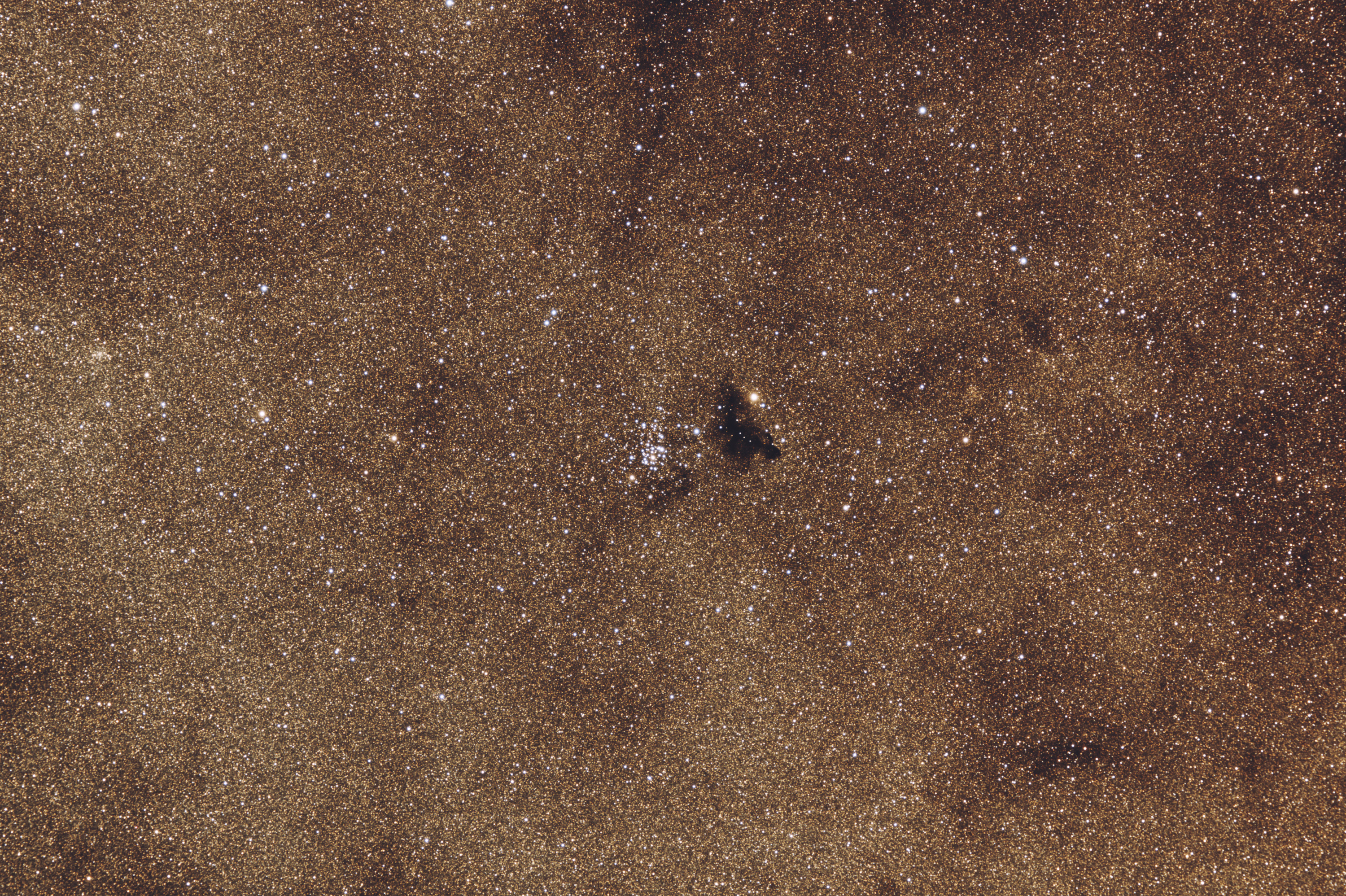 Der offene Sternhaufen NGC 6520 und die kleine, dichte Dunkelwolke B 86 bilden ein interessantes Doppel vor dem Hintergrund der dichten Sternwolken um das galaktische Zentrum.