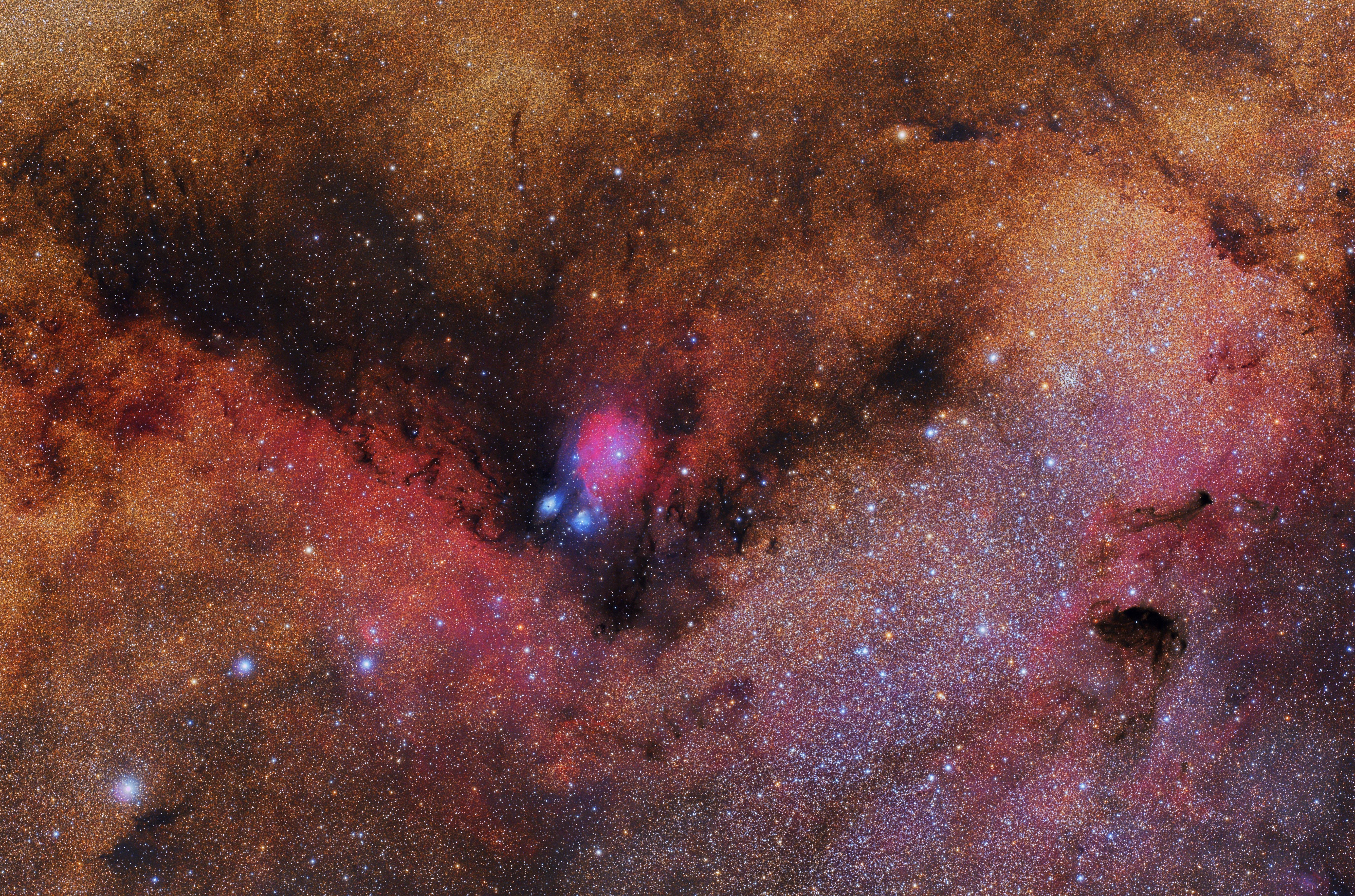 Zwischen Adler- und Omega-Nebel nördlich und Lagunen- und Trifid-Nebel südlich befindet sich ein ausgedehnter, visuell wenig auffälliger Komplex aus Dunkelwolken, Emissions- und Reflexionsnebeln. Die beiden blauen Nebel auf dem Bild sind NGC 6589 und 6590. Rechts unterhalb finden wir die kleine Sagittariuswolke M24, sowie die Dunkelnebel B92 und 93, sowie den kleinen offenen Sternhaufen NGC 6609.