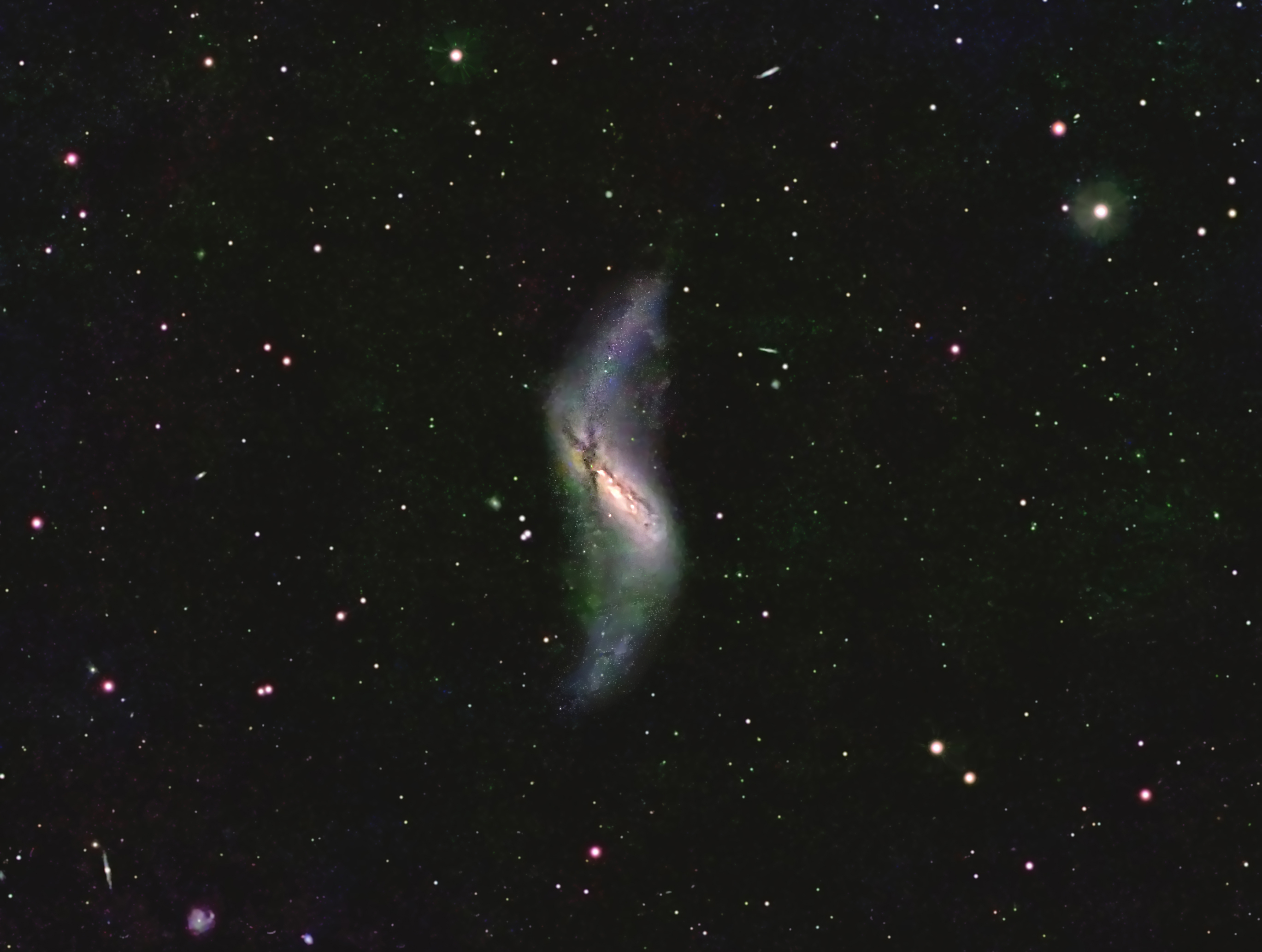 NGC 660 ist eine Polarringgalaxie im Sternbild Fische. Da sie im Februar nur in der ersten Nachthälfte zu sehen ist, waren mehrere Abende zur Aufnahme notwendig. Einige klare, aber kalte Nächte bei uns in Norddeutschland ermöglichten dann dieses Foto.