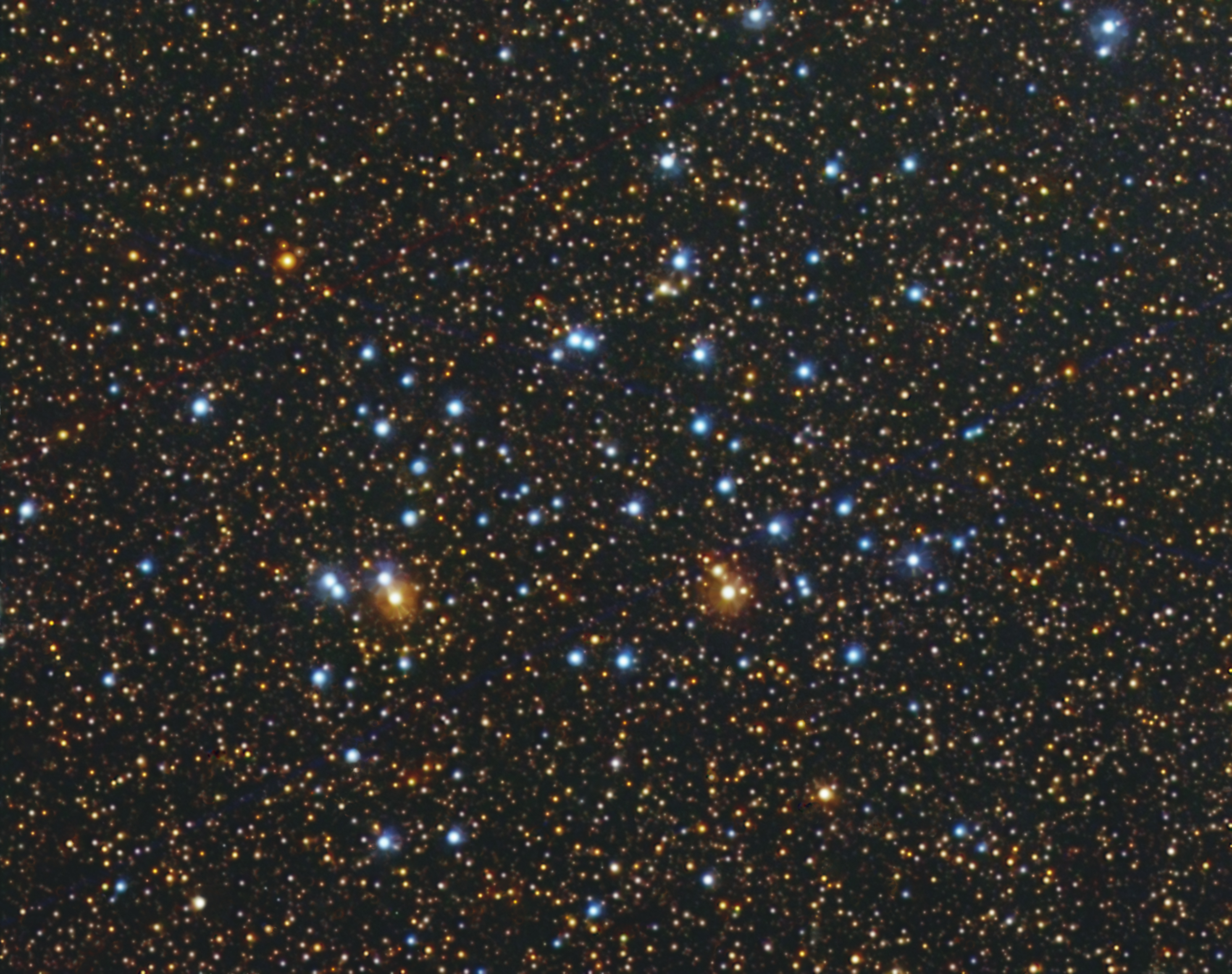 NGC 6709 ist ein offener Sternhaufen im Sternbild Adler. Er ist noch verhältnismäßig jung, was auch an den zahlreichen blauen Sternen deutlich wird. Zur Farbkalibration habe ich Daten von Gaia verwendet. Eine klare und warme Sommernacht bei uns in Norddeutschland ermöglichte diese Aufnahme.