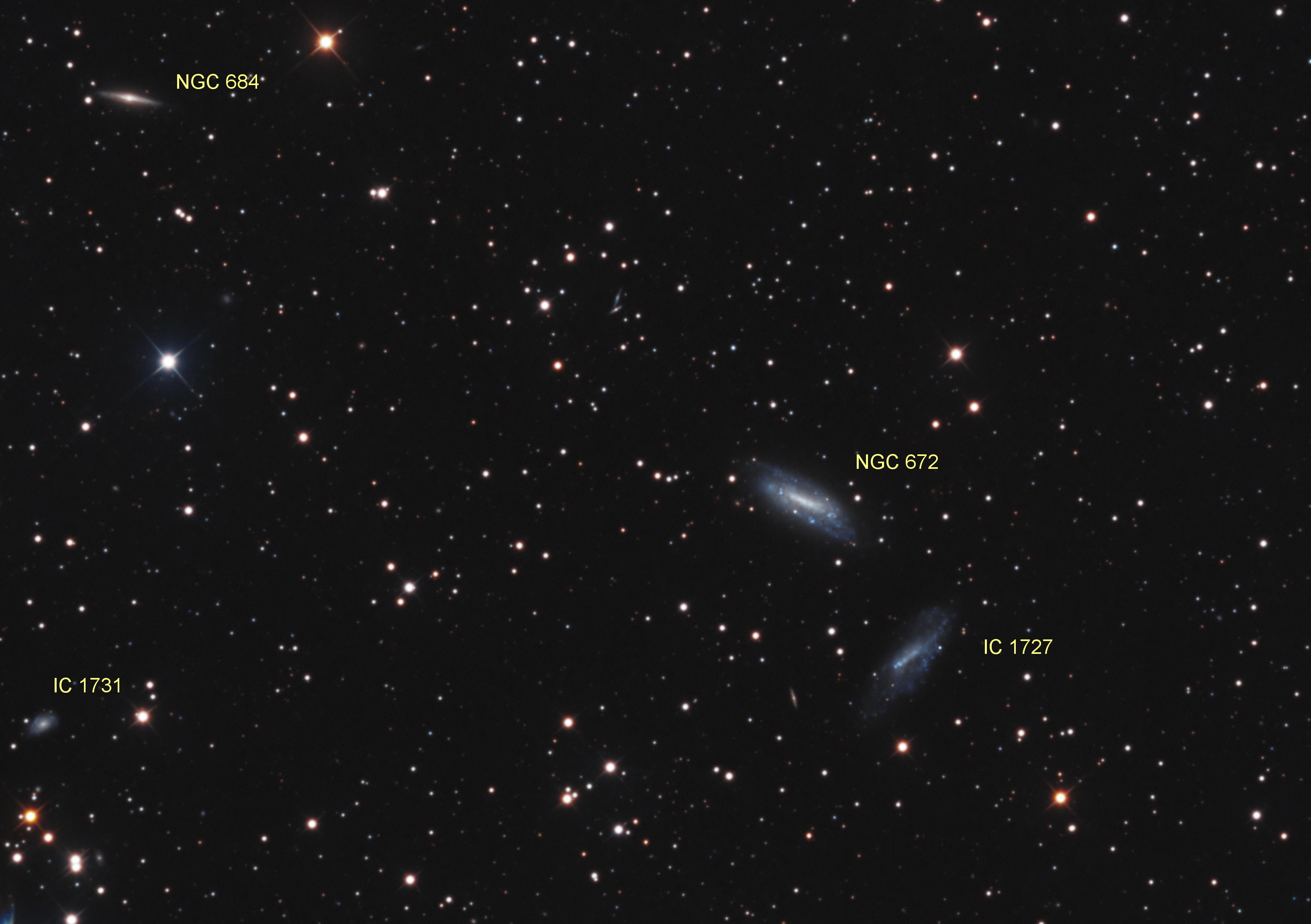 NGC 672 ist eine Balkenspiralgalaxie im Sternbild Dreieck. Sie hat einen Scheibendurchmesser von rund 50000 Lichtjahren und ist etwa 24 Millionen Lichtjahre von uns entfernt. Sie bildet ein wechselwirkendes Paar mit der weniger als 90000 Lichtjahre von ihr Nachbarin IC 1727. Diese ist ebenfalls eine Balkenspirale. Bei ihr zeigen sich die Folgen der Wechselwirkung mit der nahen NGC 672 deutlich daran, dass IC 1727 asymmetrisch in ihrer Struktur ist und ihr Kern nicht im Zentrum liegt.