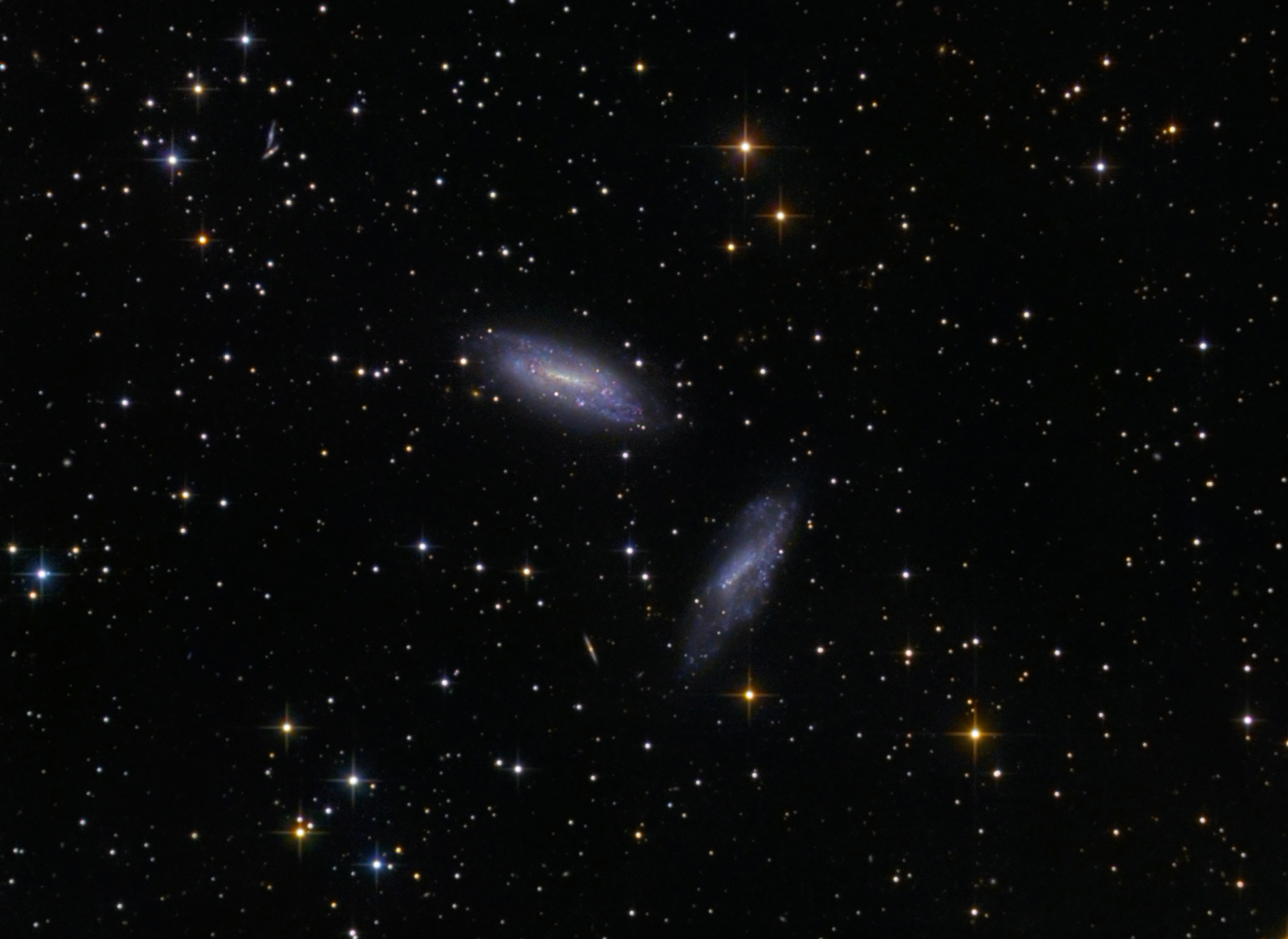 Die Balkengalaxie NGC 672 liegt im Sternbild Dreieck und bei ihr in unmittelbarer Nähe IC 1727. Beide sind auch gravitativ aneinander gebunden und unterliegen einer sichtbaren Wechselwirkung. Nachdem ich die Luminanzbilder Ende August aufgenommen hatte, musste ich sechs Wochen auf geeignetes Wetter für die Farbaufnahmen warten.