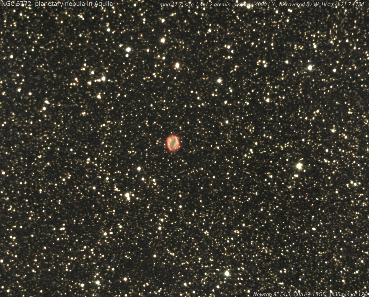 Das ist ein schöner Planetarischer Nebel mit 12,7 mag nahe der großen Scutum-Sternwolke. Ich nahm ihn wettermäßig an drei Abenden auf, genau 239 Jahre nach seiner Entdeckung durch W. Herschel (21. Juli 1784). Seine Entfernung beträgt etwa 4000 Lichtjahre, die scheinbare Größe von 1,4 x 1,2 Bogenminuten entspricht dabei etwa 2,7 Lichtjahren.
