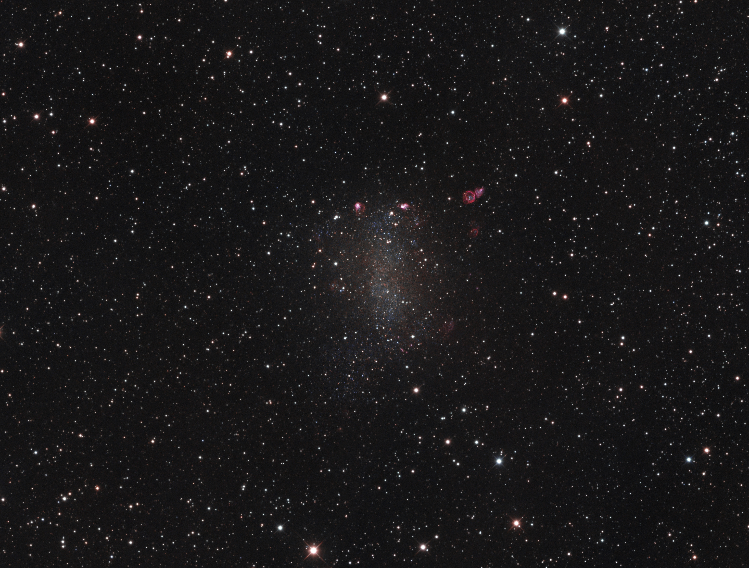 NGC 6822 ist eine irreguläre Zwerggalaxie im Sternbild Schütze. Sie ist rund 1,6 Millionen Lichtjahre von uns entfernt und hat einen Durchmesser von etwa 8000 Lichtjahren. Sie besitzt etwa 10 Millionen Sterne (im Vergleich zu den 400 Milliarden Sternen unserer Galaxie) und 150 Sternentstehungsgebiete, als rote Blasen erkennbar.