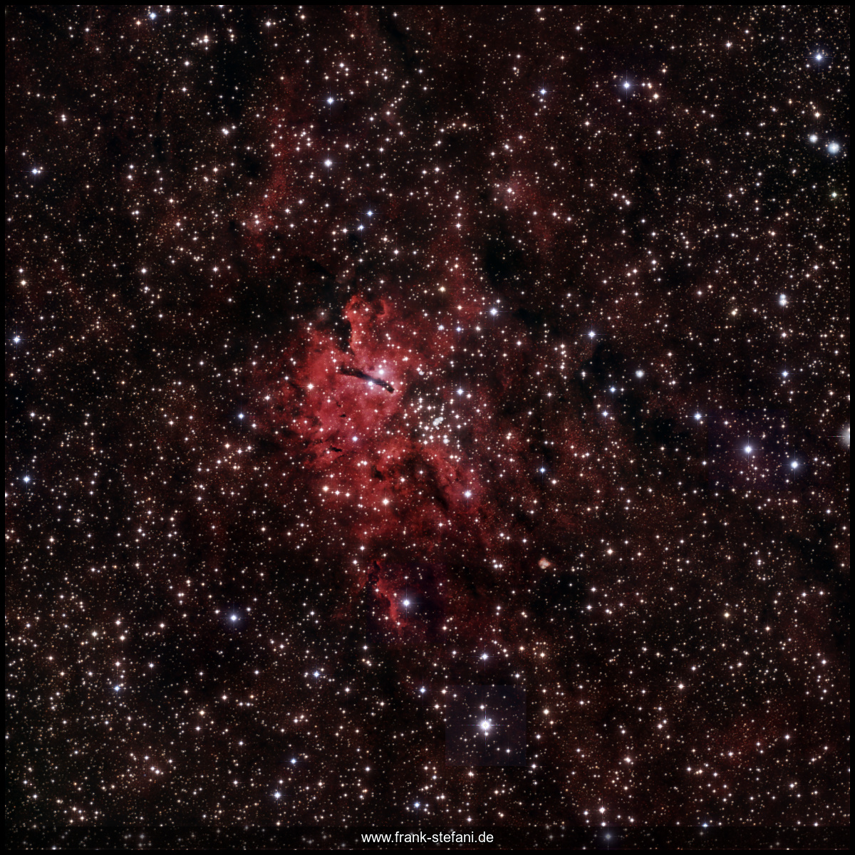 Die Sommermilchstraße steht Anfang November bereits westlich des Meridians. Auf Grund der für Deep-Sky-Fotografie seit Monaten ungünstigen Wettersituation hier in den Alpen, habe ich mich dennoch entschlossen, diesem interessanten Objekt im Sternbild Füchschen (Vul) während seines allmählichen Untergangs (hinter unseren Bergen) hinterher zu fotografieren. So kam ich in zwei aufeinander folgenden Nächten immerhin auf eine Integrationszeit von 3:30 Stunden (70 x 180s), mit 500 mm Brennweite f/5.6 und einem UV/IR-cut-Filter. Die schiere Menge an Sternen in Richtung des Zentrums unserer Heimatgalaxie galt es dann bei der Bildbearbeitung zurück zu drängen. Hinter diesen erscheint der rote Nebel aus ionisiertem Wasserstoff (HII) eher unauffällig, was natürlich auch an der insgesamt kurzen Integrationszeit liegt. Man erkennt die dunkle Staubsäule gut, die mich ihrer ausgeprägten Form wegen sofort an den Elefantenrüsselnebel (IC1369) im Sternbild Kepheus (Cep) erinnerte. Auch der Sternhaufen (NGC 6823) im Bildzentrum hebt sich ordentlich von seiner Umgebung ab. Er ist ca. 6000 Lichtjahre von der Erde entfernt und liegt für einen Beobachter auf der Erde in relativer Nähe zum bekannten Hantelnebel (M27).
