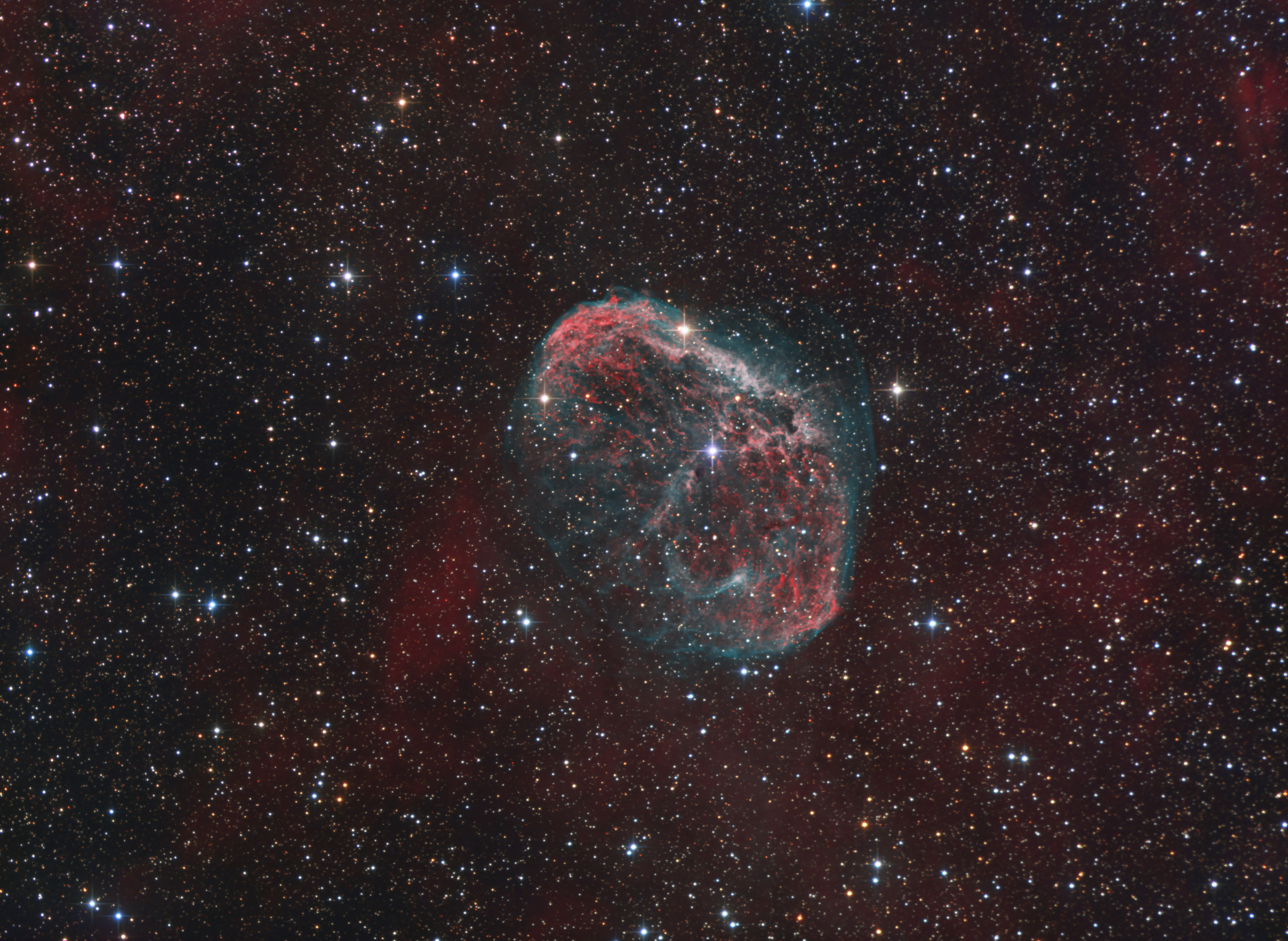 Einer der sehr oft fotografierten Emissionsnebel im Sternbild Schwan ist der Crescent Nebel NGC 6888, der vom Wolf-Rayet-Stern WR 136 angeleuchtet wird. In die RGB-Kanälen werden Schmalbandaufnahmen in H-Alpha und O-III eingebunden, was echte Sternfarben und gleichzeitig die Betonung der verschiedenen Nebelregionen ermöglicht.