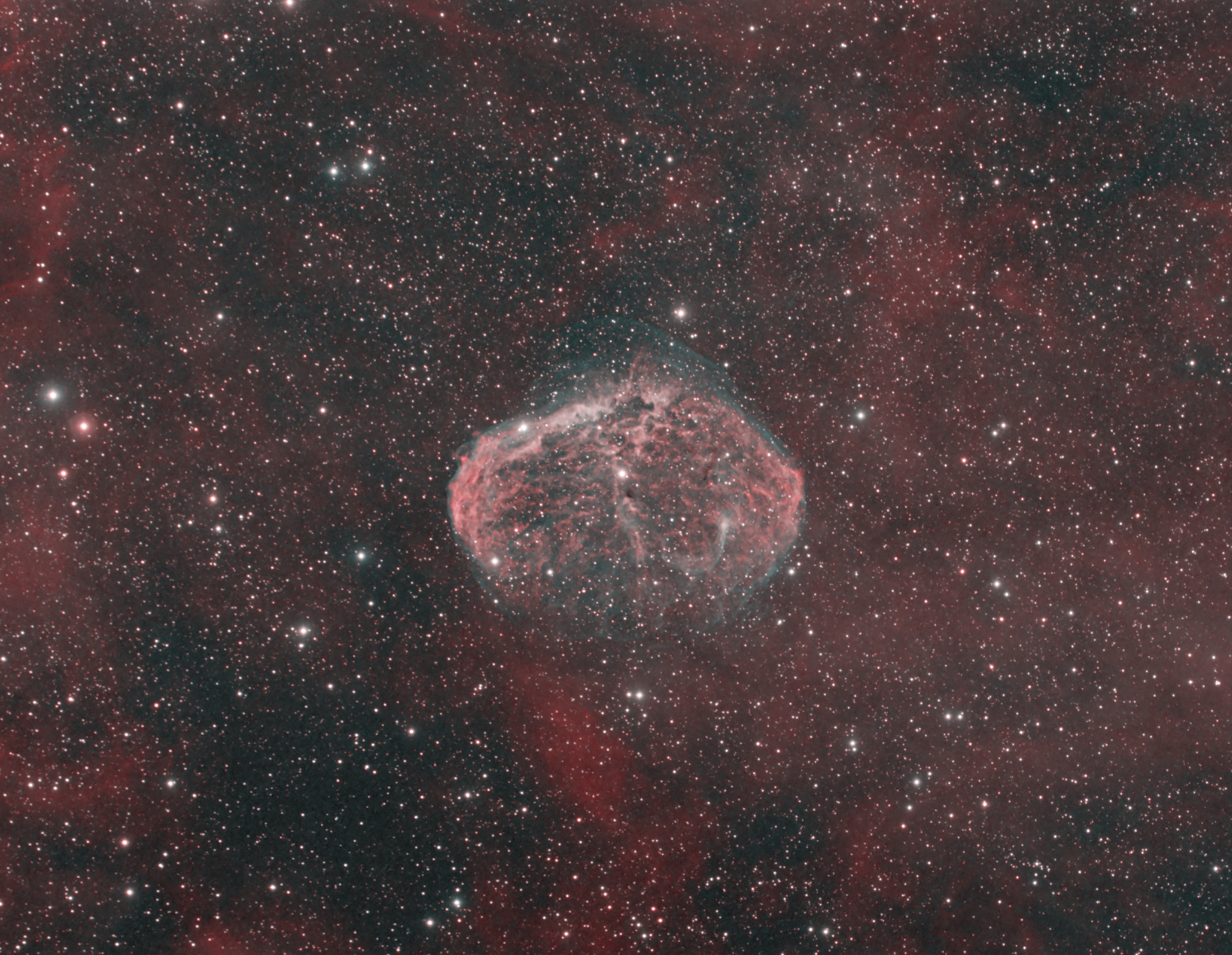 Das Bild ist ein Komposit aus R = H-alpha, G = OIII und B = OIII.