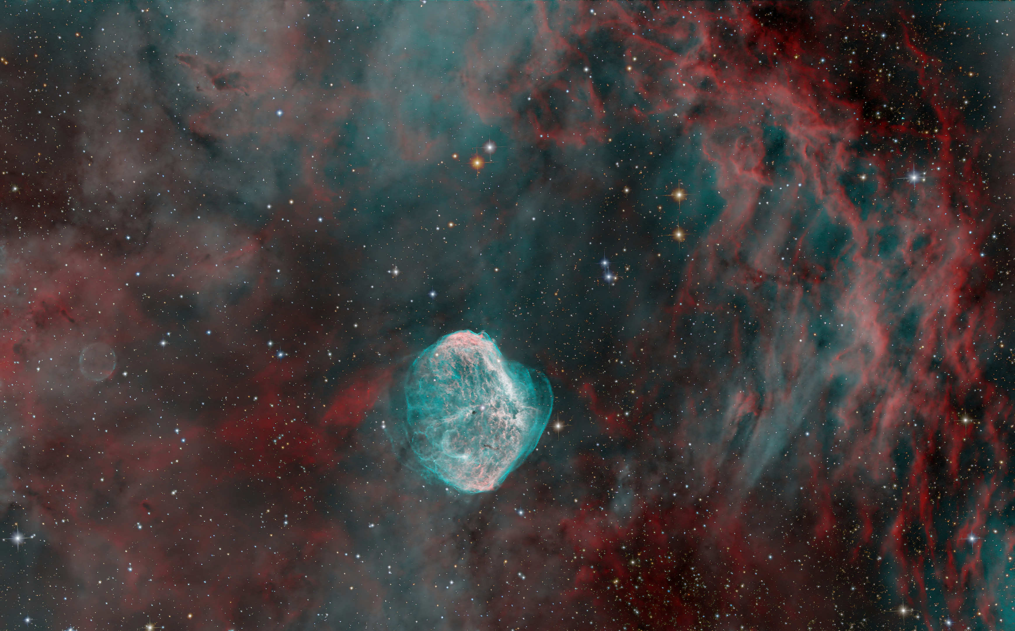 Mein »NGC 6888-Projekt«: Aufnahme mit zwei unterschiedlichen Kameras und zwei Newton-Teleskopen in mehreren Nächten im Juli. Insbesondere wollte ich die OIII-Strukturen zur Geltung bringen. Aus diesem Grund habe ich insgesamt 12 h mit einem OIII-Filter (an QHY163m Kamera) fotografiert und zusätzlich für H-Alpha und OIII einen DuoBand-Filter an der QHY268c Kamera genutzt. Die RGB Sterne habe ich mit einem UVIR Filter an der QHY268c Kamera aufgenommen. Die Bildbearbeitung fand im Wesentlichen in PixInsight statt.