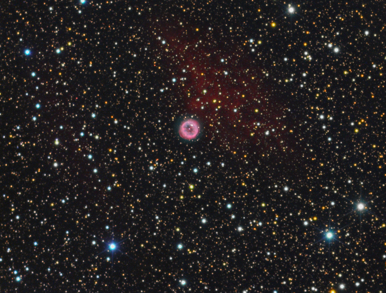NGC 6894, ein Planetarischer Nebel im Sternbild Schwan hat nur eine Winkelausdehnung von 0,92 Bogenminuten. Der Nebel zeigt deutlich Wechselwirkung mit dem interstellaren Medium rechts oberhalb im Bild.