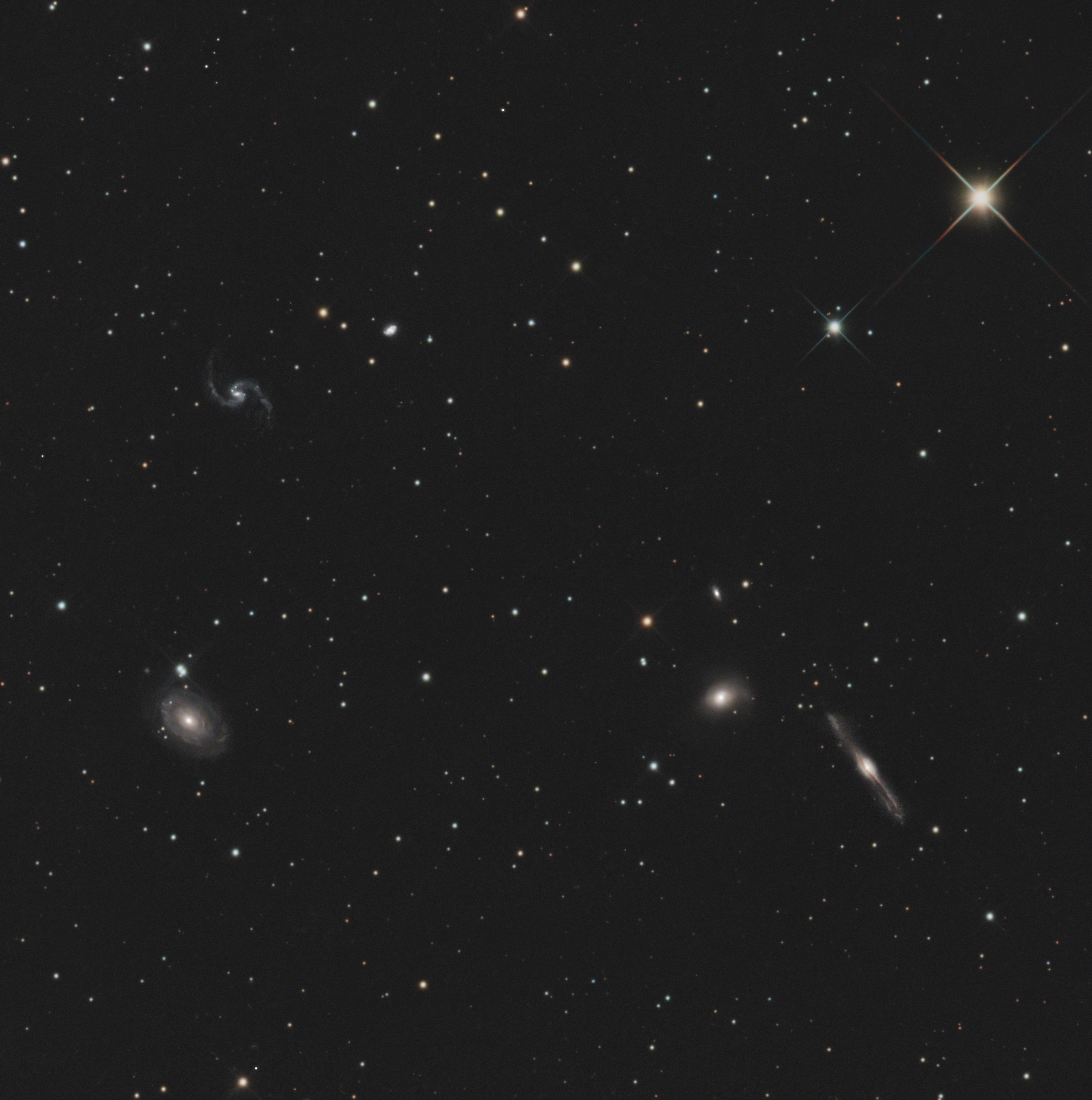 Die NGC-691-Gruppe (auch LGG 34) ist eine Ansammlung von etwa zehn gravitativ gebundenen Galaxien im Sternbild Widder (Aries), deren hellstes Mitglied die Spiralgalaxie NGC 691 selbst ist, die etwa 120 Millionen Lichtjahre entfernt liegt. Die Gruppe wurde nach NGC 691 benannt, die auch Merkmale wie eine dreifache Ringstruktur aufweist, und enthält weitere Mitglieder wie NGC 680, NGC 694 und IC 167. Aufgenommen mit dem Antlia Quad-Band-Filter, um der Lichtverschmutzung in meiner Wohngegend etwas entgegen zu wirken.