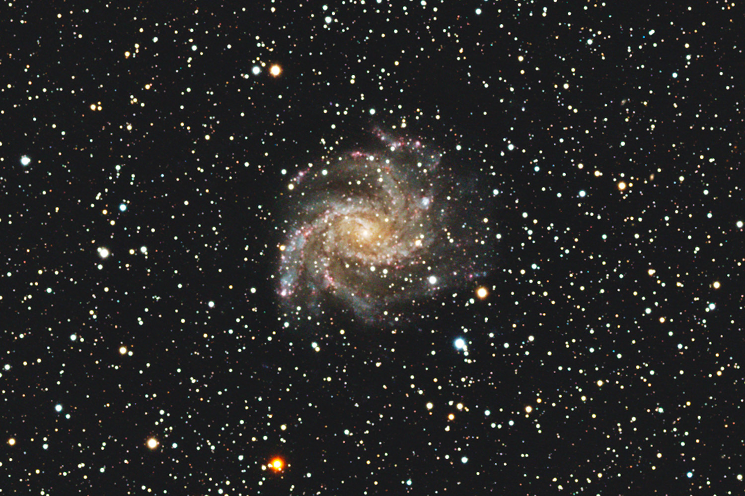 Die sogenannte "Fireworks Galaxy" NGC 6946 liegt inmitten der Sommermilchstraße im Cepheus und versteckt sich damit hinter vielen Vordergrundsternen sowie interstellarem Gas und Staub. Bekannt ist sie für ihre vielen (9) Supernovaexplosionen in den letzten 100 Jahren. Der tiefrote Stern am unteren Bildrand ist ein Kohlenstoffstern.