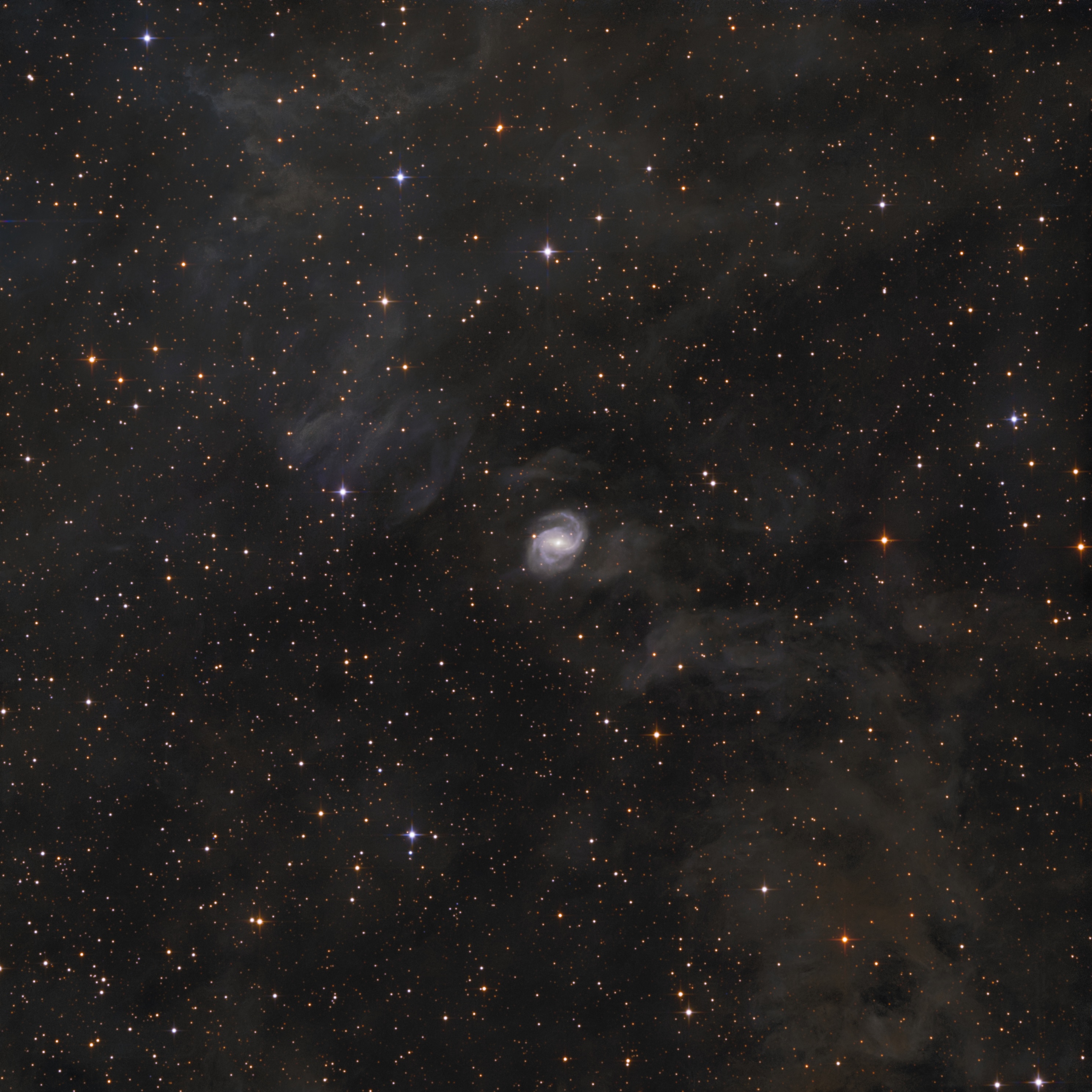 Diese Balkenspiralgalaxie im Kepheus hat mich gleich angesprochen auf meiner Objektsuche, weil sie einerseits schön strukturierte Spiralarme hat und andererseits von einer ebenso hübsch strukturierten Staubwolke teilweise überlagert ist, wodurch die kleine Brennweite bei der Objektwahl wieder entschuldbar wird. Die unerkannte Doppelbeobachtung 1885 von Swift bzw. 1887 von Coggia führte zu dem Doppeleintrag im NGC-Katalog mit den Nummern 6951 und 6952.