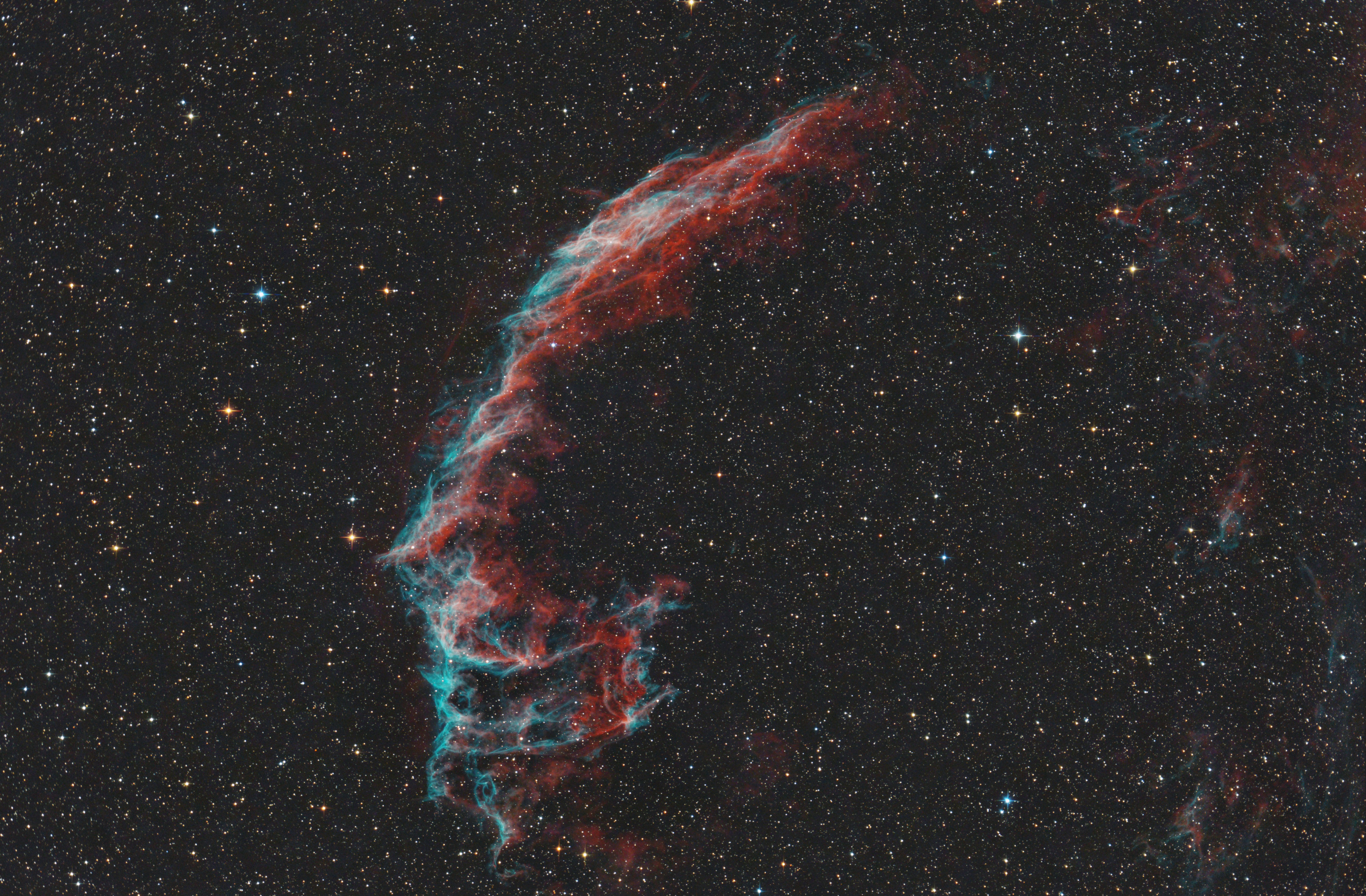 Um einerseits auch nicht ganz mondlose Nächte für Fotos nutzen zu können und andererseits die ausgedehnten H-Alpha-Strukturen in diesem Supernova-Überrest im Sternbild Schwan sichtbar zu machen, sind in diesem Bild auch insgesamt 205 Minuten mittels Optolong-Schmalbandfilter enthalten.