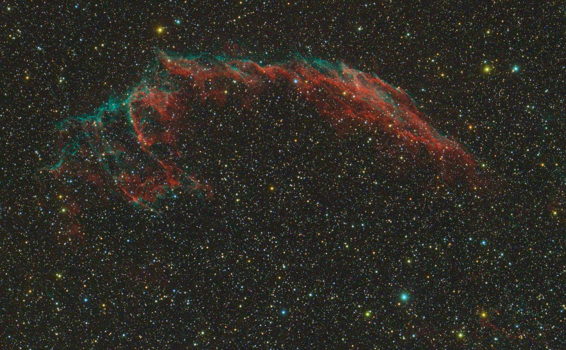 Der Zirrus-Nebel im Sternbild Schwan ist der Überrest einer Supernova vor 10000 bis 20000 Jahren in rund 2400 Lichtjahren Entfernung. Er wurde 1784 von Willam Herschel entdeckt. Gezeigt ist der östliche Teil.