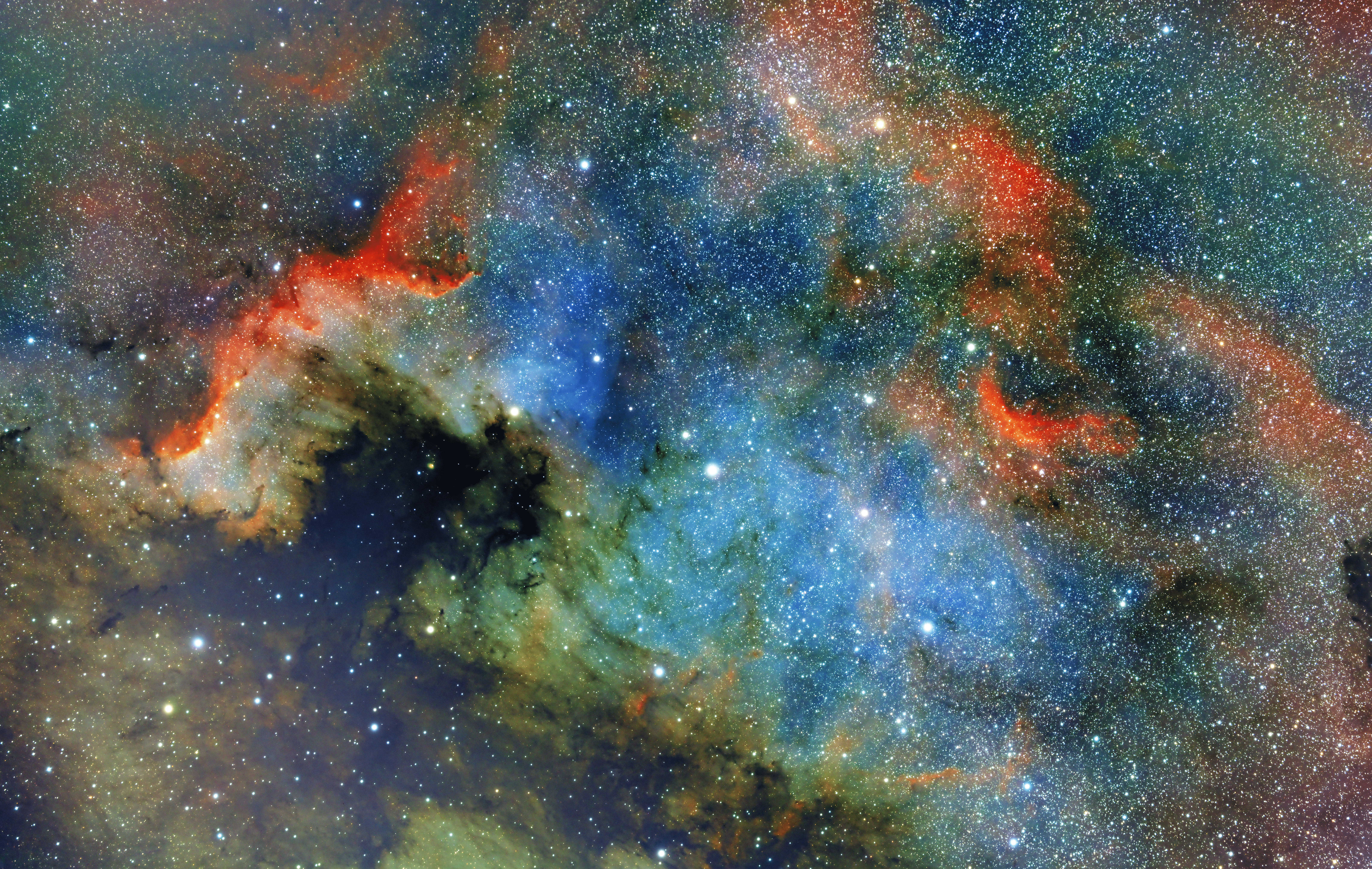 Zweiter Versuch: Immer ein Sommerfoto wert - der Nordamerikanebel, wenn da nicht die kurzen und wenigen astrofotofähigen Nächte wären. Die Faszination der durch das UV-Licht naher Sterne zum Leuchten angeregten ionisierten Wolken, die durch bizarre, lichtundurchlässige Dunkelwolken einem abstrakten Kunstwerk gleich unterbrochen werden, kennt keine Grenzen. Die Gesamtbelichtungszeit betrug 160 Minuten auf zwei Nächte aufgeteilt bei vorstadtmäßigem Bortle 5. Ich habe dieses Bild in der Hubble Palette ausgearbeitet – ein erster Versuch.