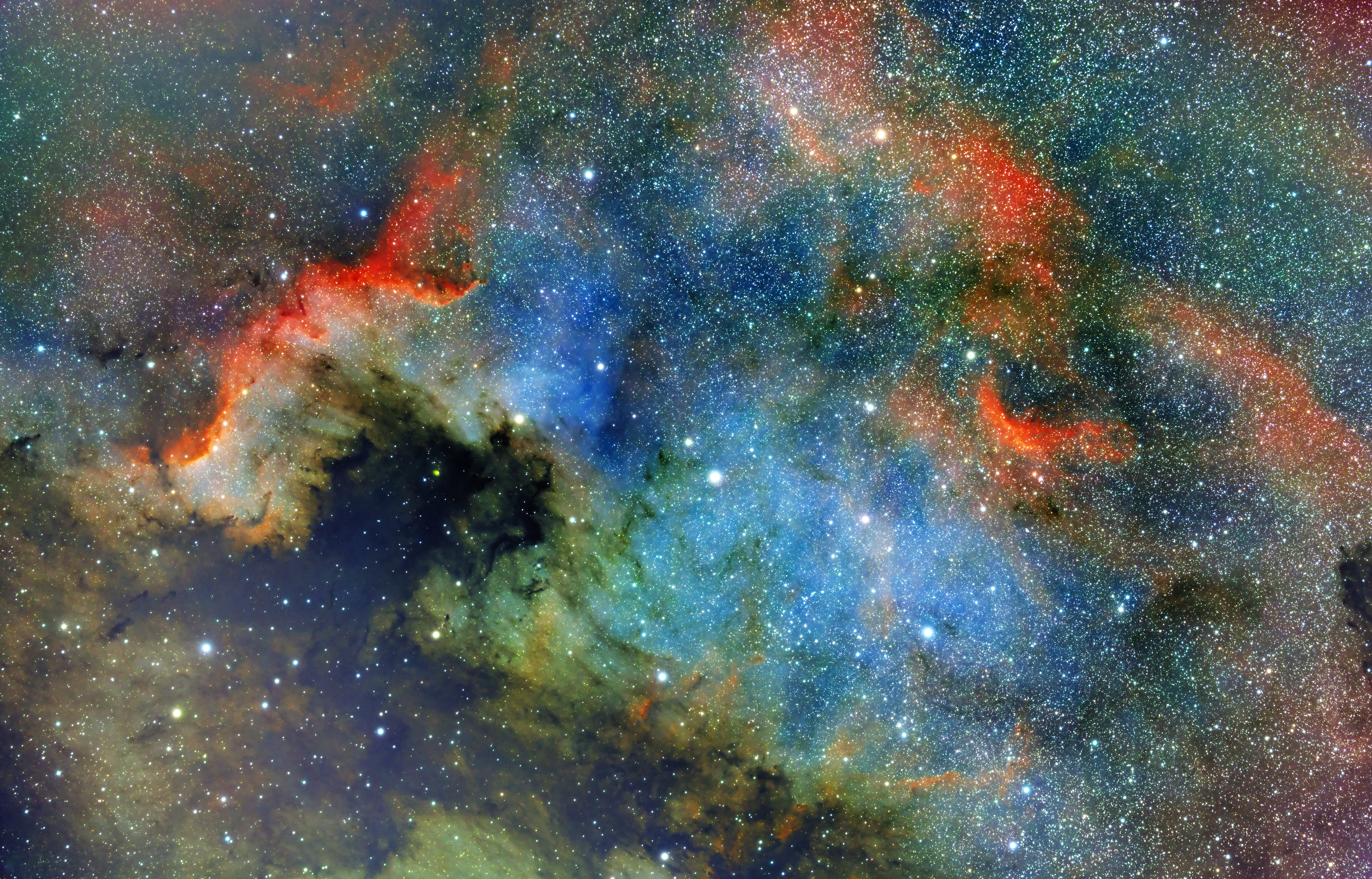 Immer ein Sommerfoto wert - der Nordamerikanebel, wenn da nicht die kurzen und wenigen astrofotofähigen Nächte wären. Die Faszination der durch das UV-Licht naher Sterne zum Leuchten angeregten ionisierten Wolken, die durch bizarre, lichtundurchlässige Dunkelwolken einem abstrakten Kunstwerk gleich unterbrochen werden, kennt keine Grenzen. Die Gesamtbelichtungszeit betrug 160 Minuten auf zwei Nächte aufgeteilt bei vorstadtmäßigem Bortle 5. Ich habe dieses Bild in der Hubble Palette ausgearbeitet – ein erster Versuch.