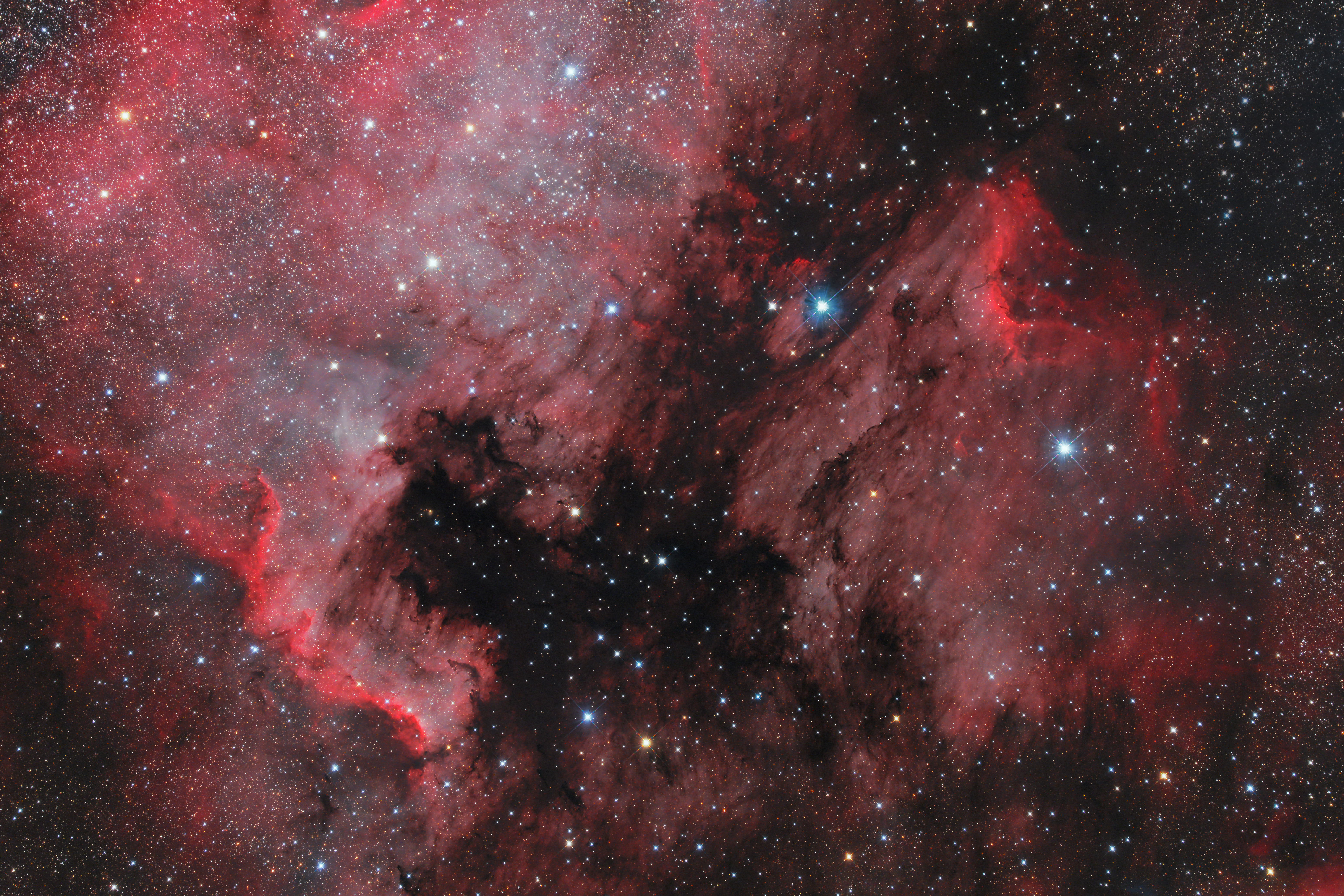 Der Nordamerikanebel ist ein diffuser Gasnebel im Sternbild Schwan. Entfernungsangaben schwanken zwischen 2000 und 3000 Lichtjahren. Er besteht überwiegend aus Wasserstoff, der in ionisierter Form (HII) sichtbares Licht in Form tiefroter Strahlung emittiert. Der Pelikannebel ist ein Emissionsnebel im Sternbild Schwan, etwa 2000 Lichtjahre von uns entfernt. Er ist durch eine Molekülwolke voll dunklem Staub vom größeren Nordamerikanebel getrennt.