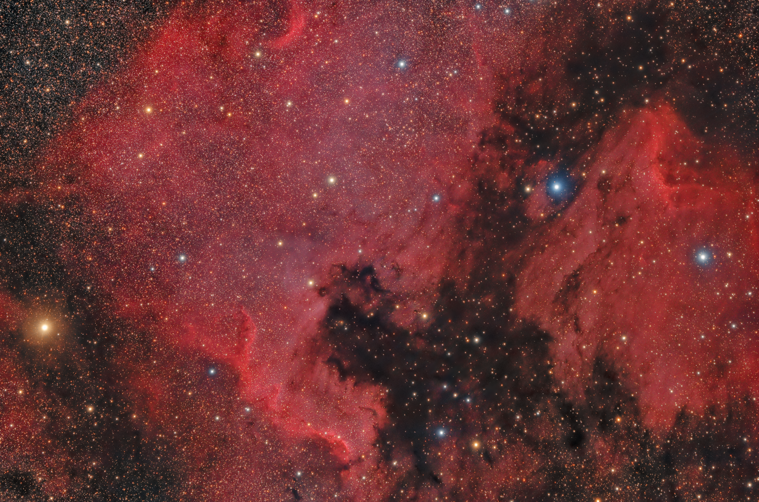 Diese ausgedehnten H-alpha-Gebiete befinden sich in der Nähe des Sterns Deneb im Sternbild Schwan, inmitten der Milchstraße. Durch einige davor liegende gigantische Dunkelwolken ergibt sich die Form des Kontinents Nordamerika (links) und die eines Pelikans (rechts). Eines der schönsten Motive am Sommerhimmel.