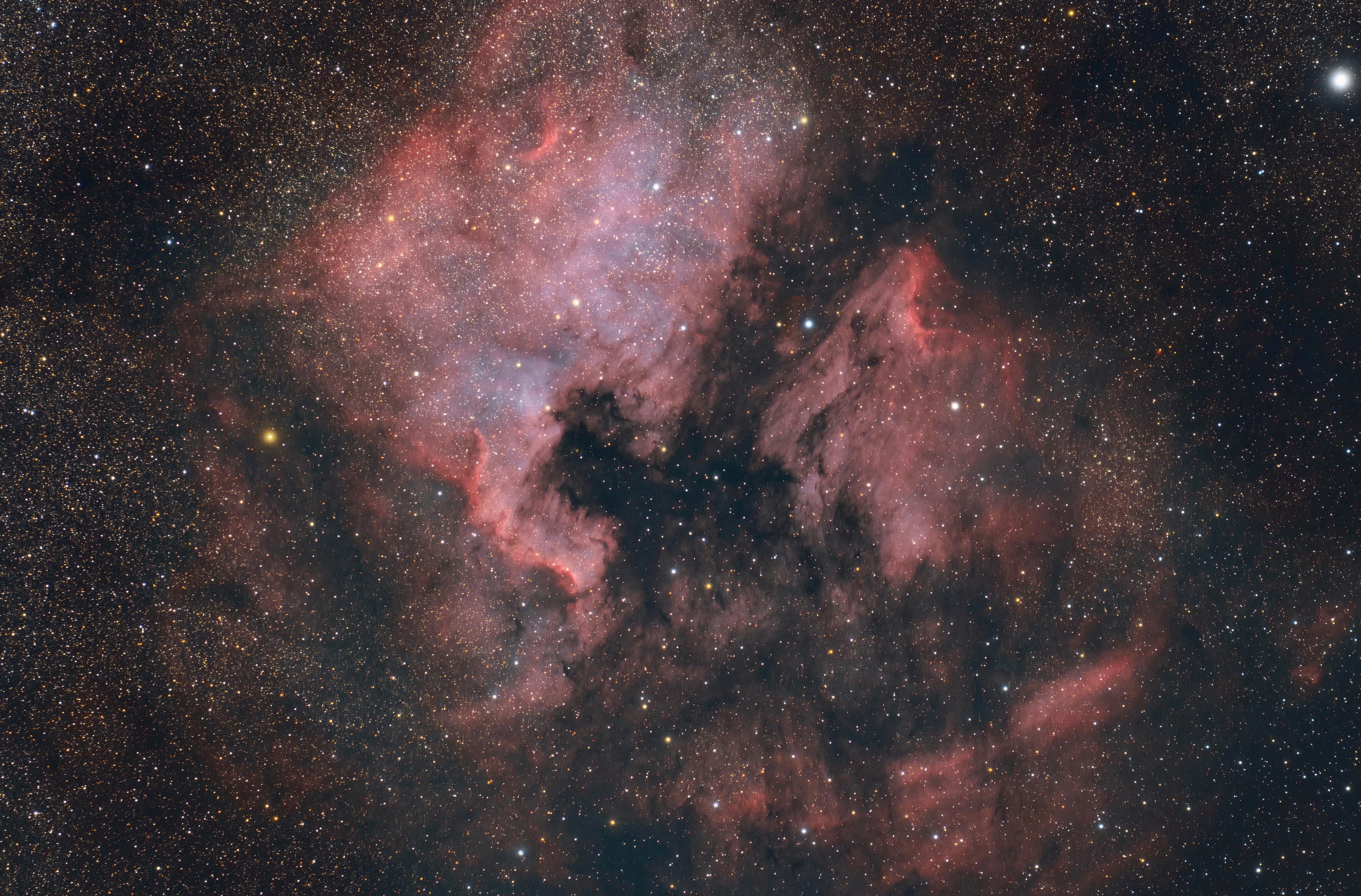 NGC 7000, der bekannte Nordamerikanebel im Sternbild Schwan. Ein gewaltiges Gebiet voller Wasserstoffgas das in seiner Form an den Nordamerikanischen Kontinent erinnert. Das Bild besteht aus normalen RGB- und LExtreme-Dual-Schmalband-Aufnahmen. Bedingt durch die kurzen Nächte in mehreren Sessions aufgenommen.
