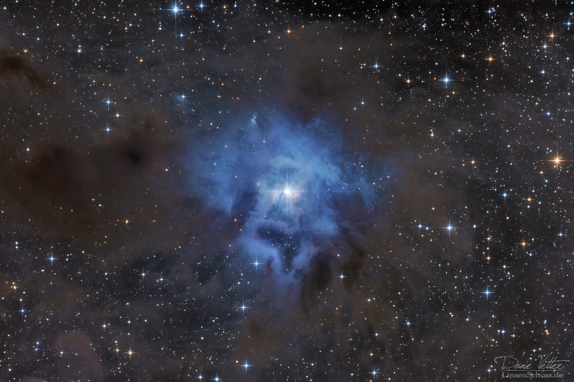 Im vergangenen Jahr habe ich mit dem Irisnebel (NGC 7023) begonnen, und irgendwie war ich nie so wirklich mit dem Ergebnis zufrieden. Ich habe damals über mehrere Nächte an die 25 Stunden dafür angesammelt. Ich habe nun die letzten Tage, zwei weitere Nächte dran gehangen. Ich bin nun auf 37 Stunden gekommen. Aufgenommen mit einem 10" Newton mit f/5 und einer ASI 2600 MC Pro @ Gain 100. Der Schritt von 25 auf 37 Stunden hat minimal etwas an Details gebracht, aber wie erwartet nicht wirklich viel. Das hätten wohl schon 50 Stunden werden soll, aber bei den wenigen klaren und mondlosen Nächten, wäre es auch etwas Vergeudung. Deswegen schliesse ich das Projekt erst einmal ab.