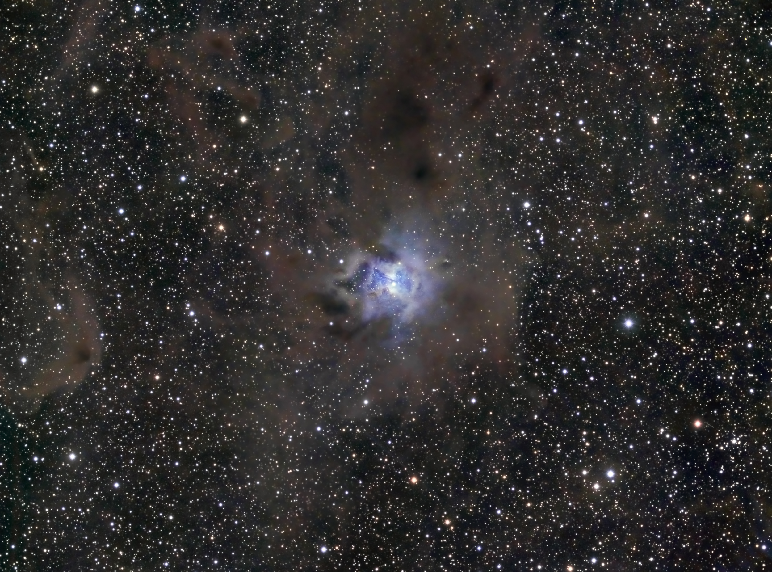 Herausgekommen ist ein LRGB des Irisnebels mit 6 Stunden Belichtungszeit. L: 15x10 min und RGB je 7x10 min. Das ist zum Darstellen der Dunkelnebel eigentlich etwas zu wenig, daher musste ich die Daten etwas quälen, aber ich denke, so kann es sich sehen lassen...