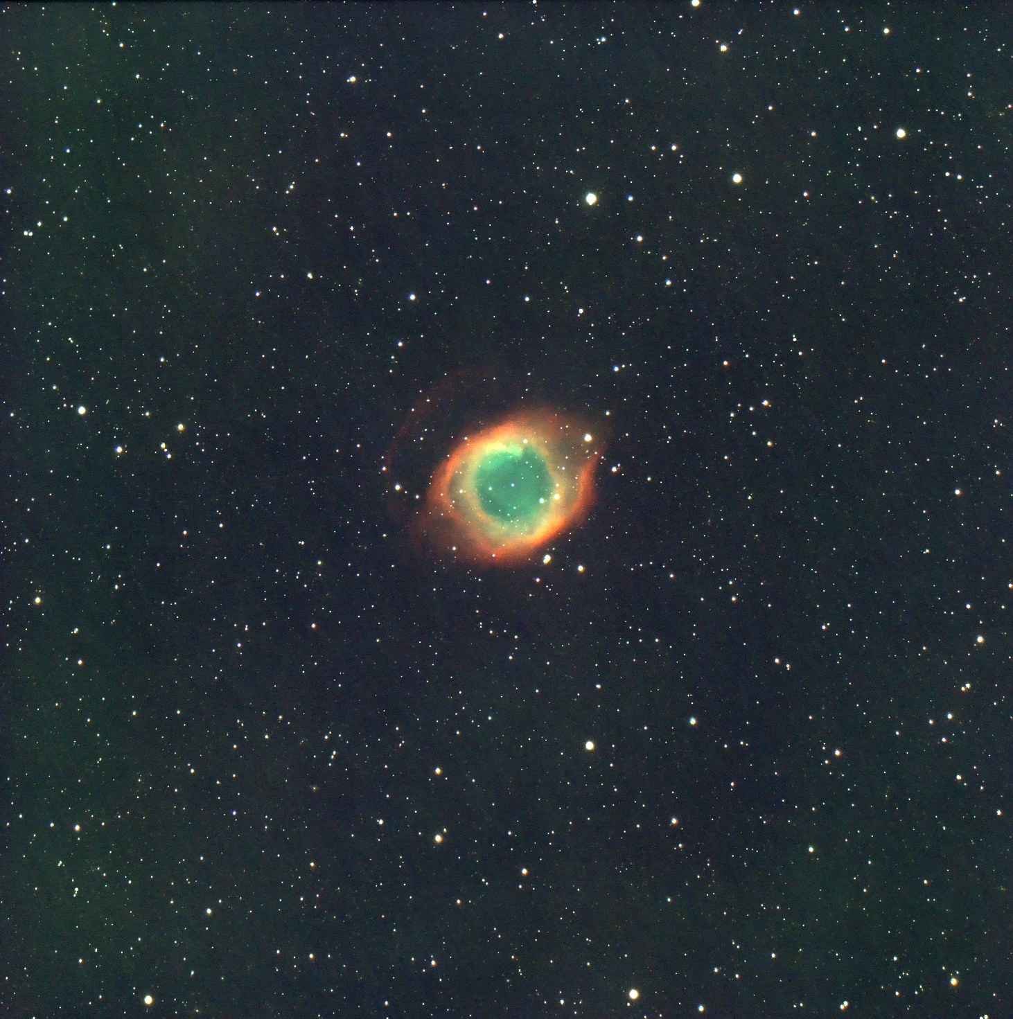 Trotz der heurigen schwierigen Wetterbedingungen mit starkem Dunst, vorüberziehenden Zirruswolken und plötzlichem Nebeleinfall, wollte ich den Helixnebel an meinem Esprit 4"/f4.1 testen und benötigte drei Abende, um 7h 50min Belichtungszeit zu erreichen.
