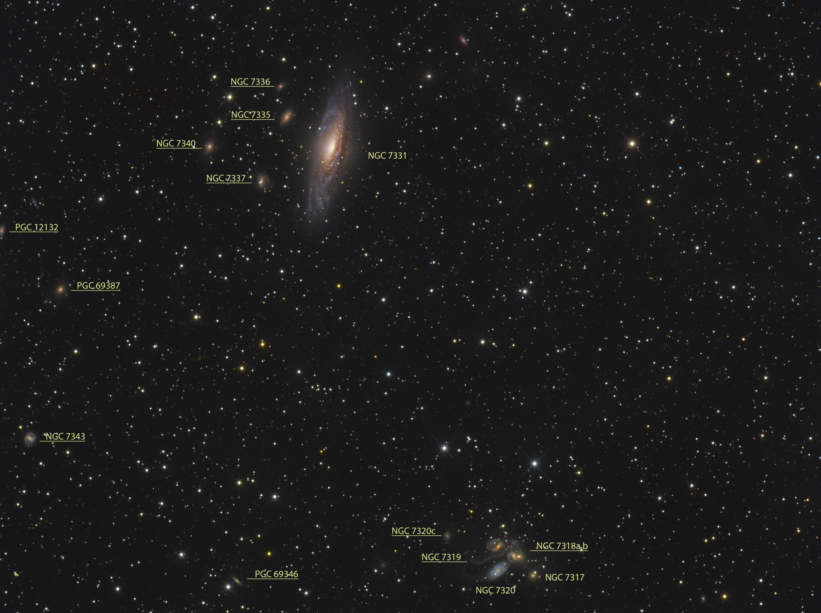 NGC 7331 (Caldwell 30) ist das hellste Mitglied einer Gruppe von Galaxien, zu der noch NGC 7335, 7336, 7337 und 7340 gehören. Letztere sind mit ca 300 Millionen Lichtjahren deutlich weiter entfernt, also nicht gravitativ mit NGC 7331 verbunden. Die Gruppe wird auch als Deer Lick Gruppe bezeichnet. NGC 7331 wurde 1784 von Wilhelm Herschel entdeckt und hat rund 140000 Lichtjahre Durchmesser. Eine Gruppe von fünf Galaxien im Sternbild Pegasus wurde 1877 vom französischen Astronom Edouard Jean-Marie Stephan entdeckt und ist heute als Stephans Quintett bekannt. NGC 7317, NGC 7318A, NGC 7318B, NGC 7319 bilden ein räumlich enges, wechselwirkendes System in etwa 300 Millionen Lichtjahren Entfernung. Aufgrund gegenseitiger Gravitationswirkung sind die Spiralarme der Galaxien unregelmäßig verformt. NGC 7320 wurde ursprünglich von Stephan zur Gruppe gezählt, hat jedoch mit 30000000 Lichtjahren eine viel geringere Entfernung. Heute zählt man dafür NGC 7320C zur Gruppe.