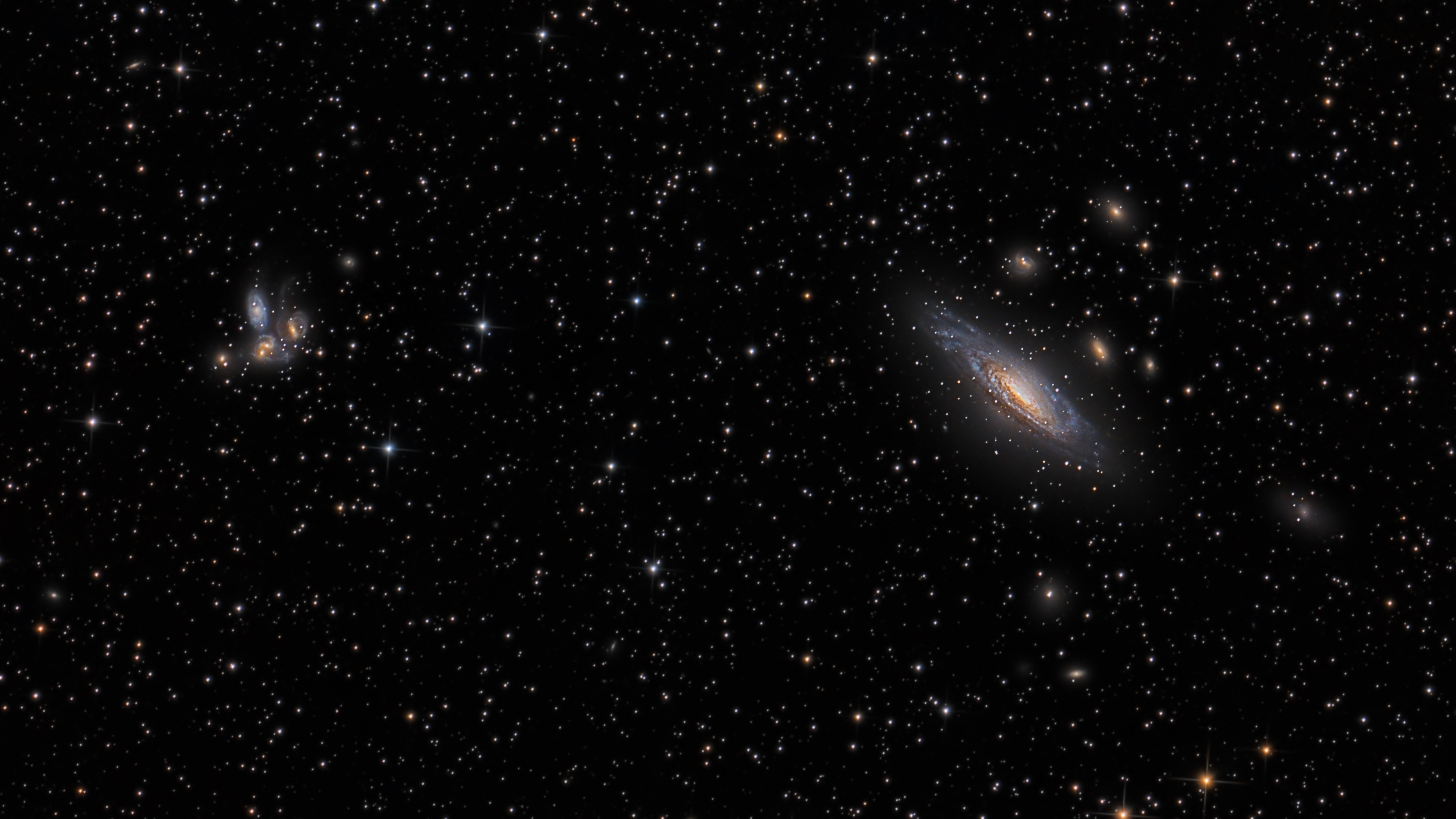 Da die Galaxie NGC 7331 mit dem benachbarten Stephans Quintett erst um Mitternacht den Meridian überquerte und ich im lichtverschmutzten Stuttgarter Raum fotografierte, benötigte ich drei Nächte um genug Bilder zu sammeln. Diese außergewöhnliche Galaxienkonstellation war dann der Lohn für die Mühe.