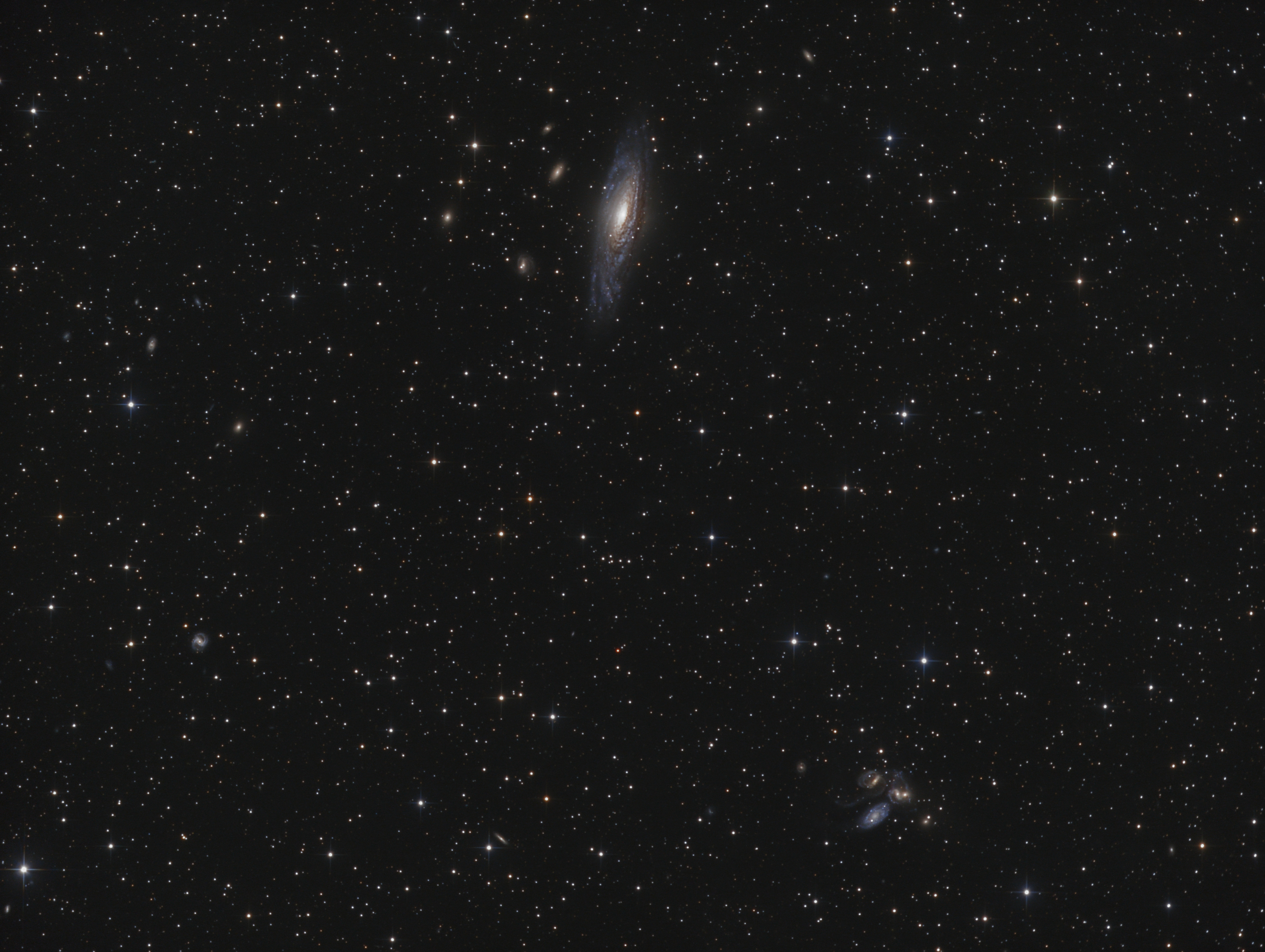 Die Spiralgalaxie NGC 7331 im Sternbild Pegasus ist etwa 46 Millionen Lichtjahre entfernt und hat einen Durchmesser von etwa 140000 Lichtjahren. Im selben Himmelsareal befinden sich noch die Galaxien NGC7335, NGC7336, NGC7337 und NGC7340. Sie liegen allerdings in einer Entfernung von 300 – 400 Millionen Lichtjahren und haben Durchmesser zwischen 75000 und 100000 Lichtjahren. Stephans Quintett besteht aus den Galaxien NGC7317, NGC 7318A, NGC7318B, NGC7319 und NGC7320C. Die Gruppe ist ein stark wechselwirkendes System, erkennbar an den verformten Galaxienarmen, in etwa 300 Millionen Lichtjahren Entfernung. Die Gruppe wurde 1877 vom französischen Astronomen Edouard Jean-Marie Stephan entdeckt. NGC 7320 wurde ursprünglich zum Quintett gezählt, gehört aber mit nur 45 Millionen Lichtjahren Entfernung eher zur NGC 7331-Gruppe.