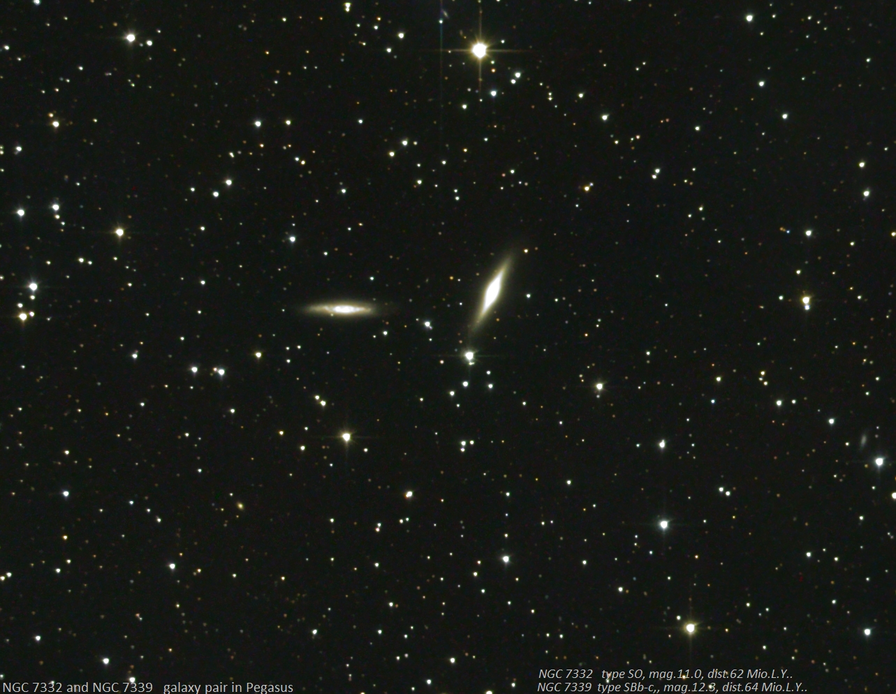 7 Grad südwestlich von Scheat (Be Peg) liegt dieses unterschiedliche Galaxienpaar, nur 7 Bogenminuten voneinander getrennt. NGC 7332 gehört zum Hubble Typ SO,dem Bindeglied zwischen den Elliptischen Galaxien E und den Spiralgalaxien S (nachHubble : "lenticulär").. Diese weisen Disk-Struktur ohne unterscheidbare Spiralarme und Dunkelwolken auf. NGC 7339 ist eine Balkenspirale von Typ SBb-c. Beide Galaxien befinden sich in ca. 65 Mio.Lichtjahren Entfernung und sind nur 5 Mio.L.J.voneinander getrennt, zeigen aber keine Anzeichen von Wechselwirkung. Entdeckt wurden beide 1784 von W.Herschel. Aufnahmen vom Jahre 2007 und Sept.2021 ergaben eine Gesamtbelichtungszeit von 6 Stunden.