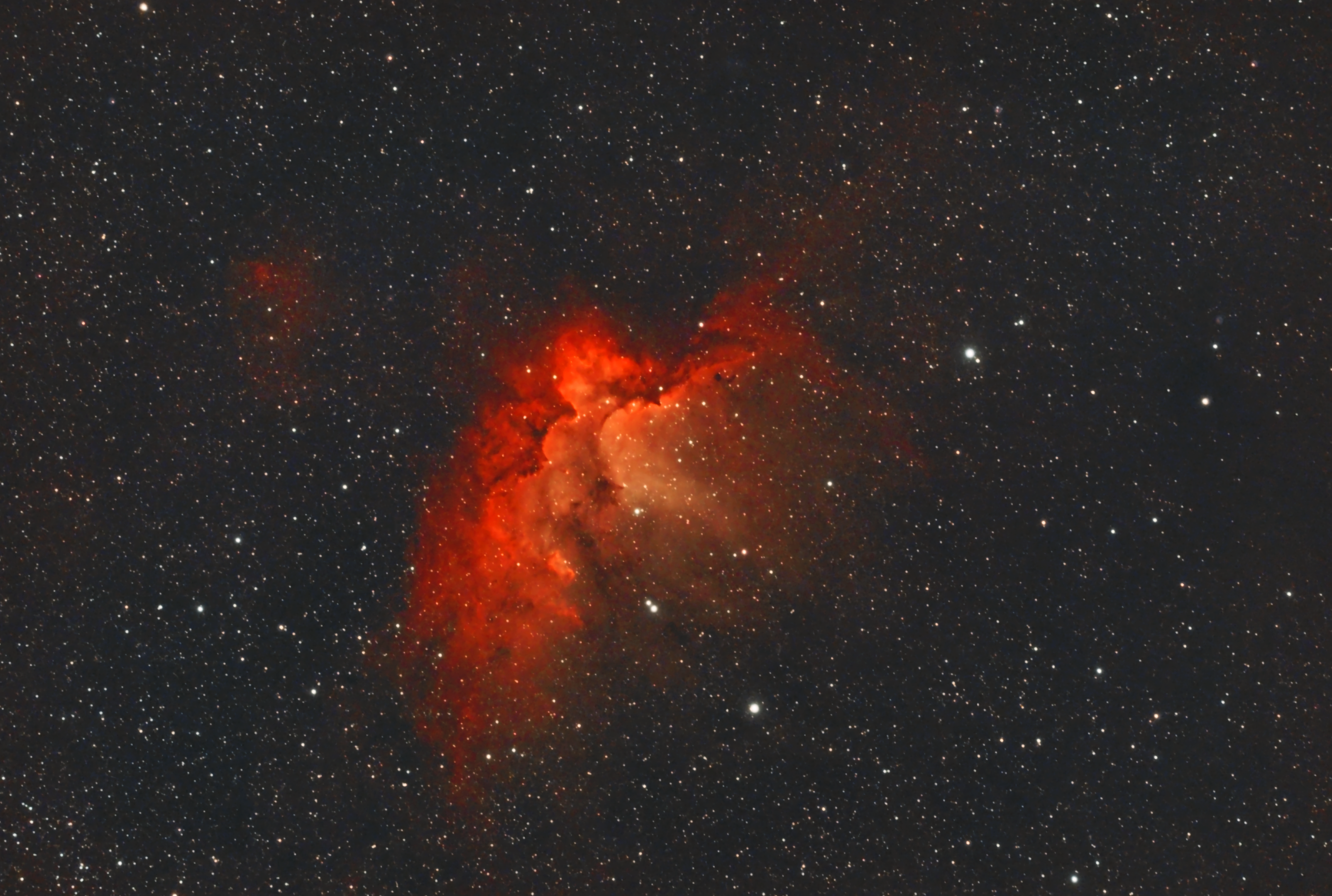 NGC 7380 oder Sh2-142, auch Zauberernebel genannt, ist ein galaktisches Sternentstehungsgebiet im Sternbild Kepheus. Das Gebiet enthält einen jungen offenen Sternhaufen, ist rund 7000 Lichtjahre entfernt und weist eine Ausdehnung von etwa 100 Lichtjahren auf. NGC7380 Zauberer Nebel mit 36 x 600 sec. Belichtungszeit.