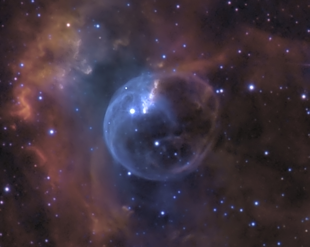 Der OIII-Anteil dieser Aufnahme entstand bereits 2013 mit einem 10-Zoll-Newton-Teleskop. Der H-alpha-Anteil wurde 2014 mit einem 12-Zoll-Newton-Teleskop bei relativ guten Bedingungen aufgenommen, so dass einige interessante Details auf der Bubble sichbar werden.