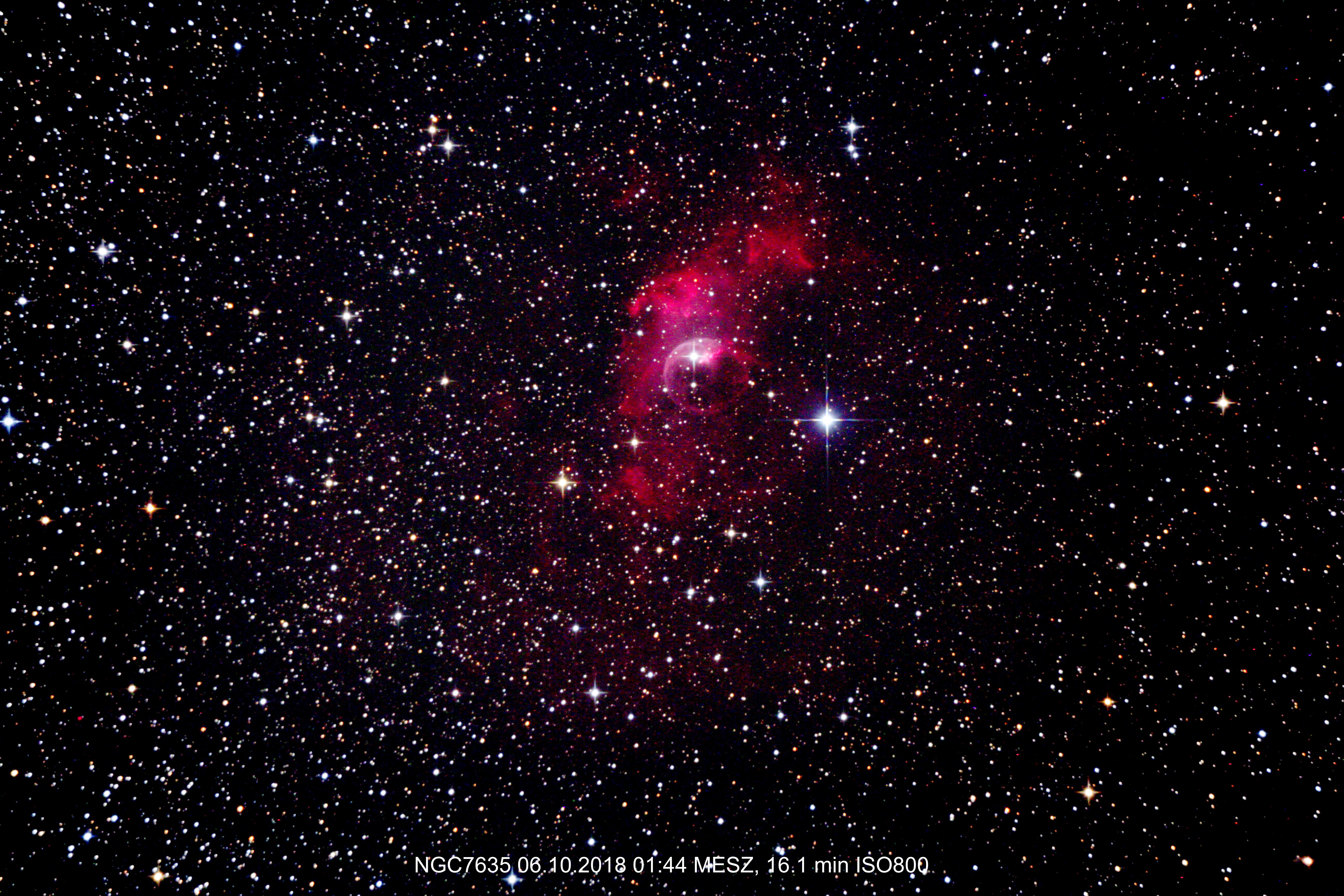 Diesmal habe ich euch ein Bild vom berühmten Bubble-Nebel (auch Blasen-Nebel genannt) herausgesucht. Das Objekt kann leicht mit einer geeigneten Kamera (gesteigerte Rotempfindlichkeit!) fotografiert werden, visuell ist von der Pracht nicht viel zu sehen. Verwendet wurde eine Canon EOS 700Da an einem 10-Zoll-Newton mit 1,4 Meter Brennweite im Primärfokus ohne weitere Optik.
