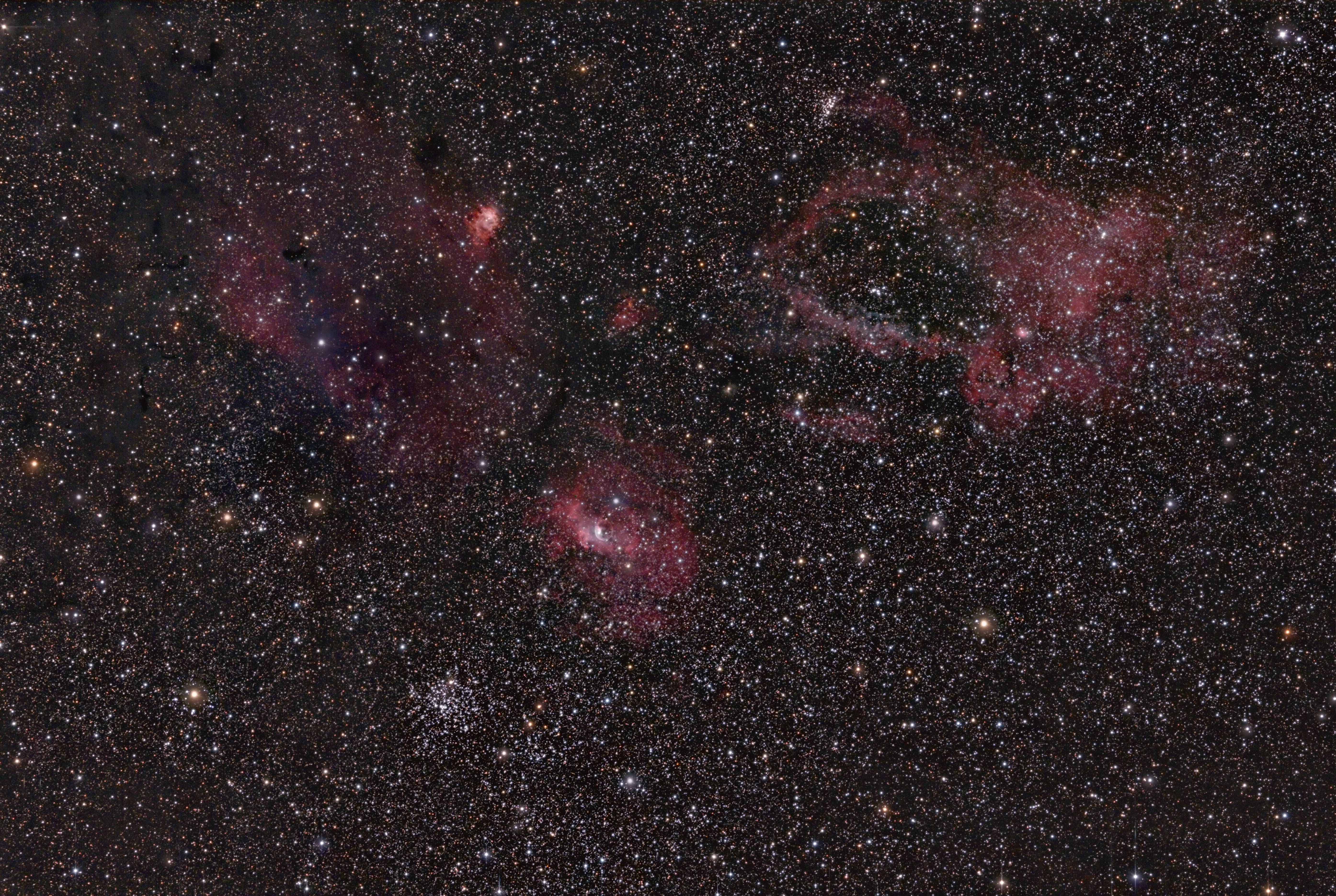 Der bekannte Bubble-Nebel steht hier in der Mitte des Bildfeldes, umgeben von einer Nebellandschaft und bekannten Sternhaufen wie M 52. Auf der linken Bildhälfte sind viele schwache Dunkelnebelfragmente zu entdecken, die sich wie Rauchschwaden durch das Bild ziehen.