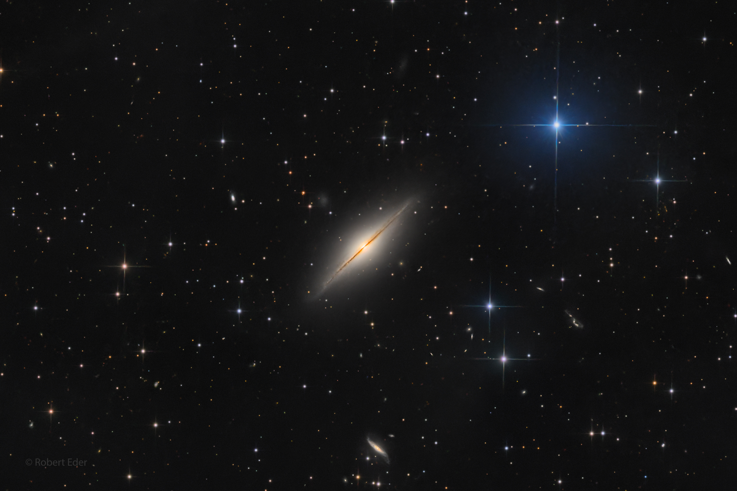 NGC 7814, oft als »Kleine Sombrerogalaxie« bezeichnet, ist eine nahezu perfekt kantenständig sichtbare Spiralgalaxie im Sternbild Pegasus, in rund 40 bis 45 Millionen Lichtjahren Entfernung. Auffällig ist die helle, kompakte Ausbuchtung, die von einem feinen, dunklen Staubband durchschnitten wird. Die Galaxie wirkt insgesamt ruhig und strukturiert, mit einer gleichmäßigen Scheibe und nur wenigen sichtbaren Störungen. Umgeben wird sie von einem dezenten Feld aus Hintergrundgalaxien und Vordergrundsternen der Milchstraße, was ihre isolierte Lage im Raum unterstreicht.