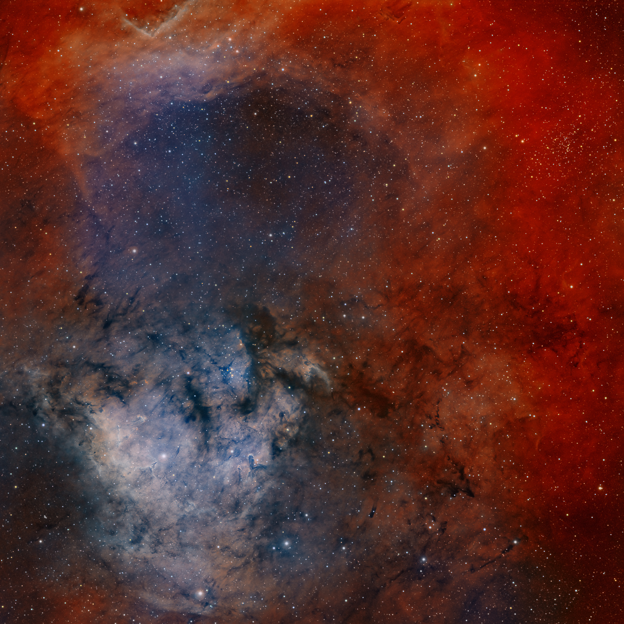 NGC 7822 ist ein interessanter Emissionsnebel im Sternbild Cepheus. Das Foto wurde aus Schmalbandaufnahmen synthetisch zusammengesetzt. Die farbigen Sterne wurden passend überlagert.