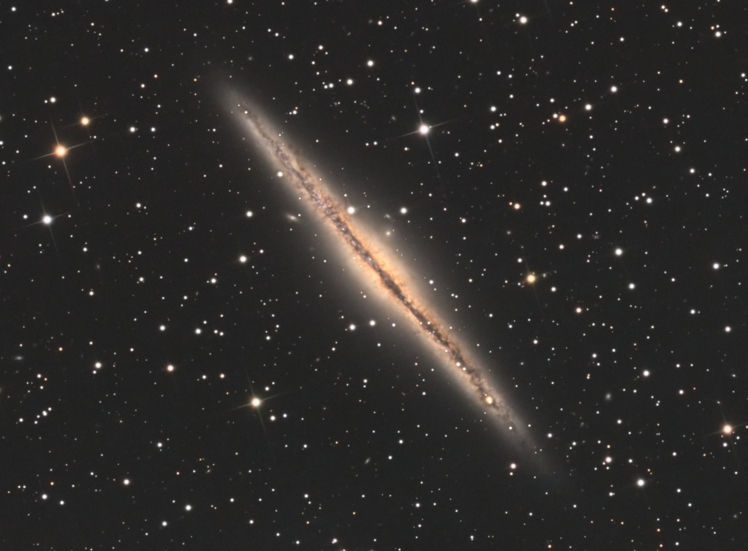 In den klaren Nächten, um die Weihnachtstage herum, bot sich diese Galaxie in der ersten Nachthälfte an, sie zu fotografieren. Was NGC 891 besonders macht, ist ein besonders schöner Blick auf die Staubstruktur, welche sich durch die Kantenlage der Galaxie zieht.