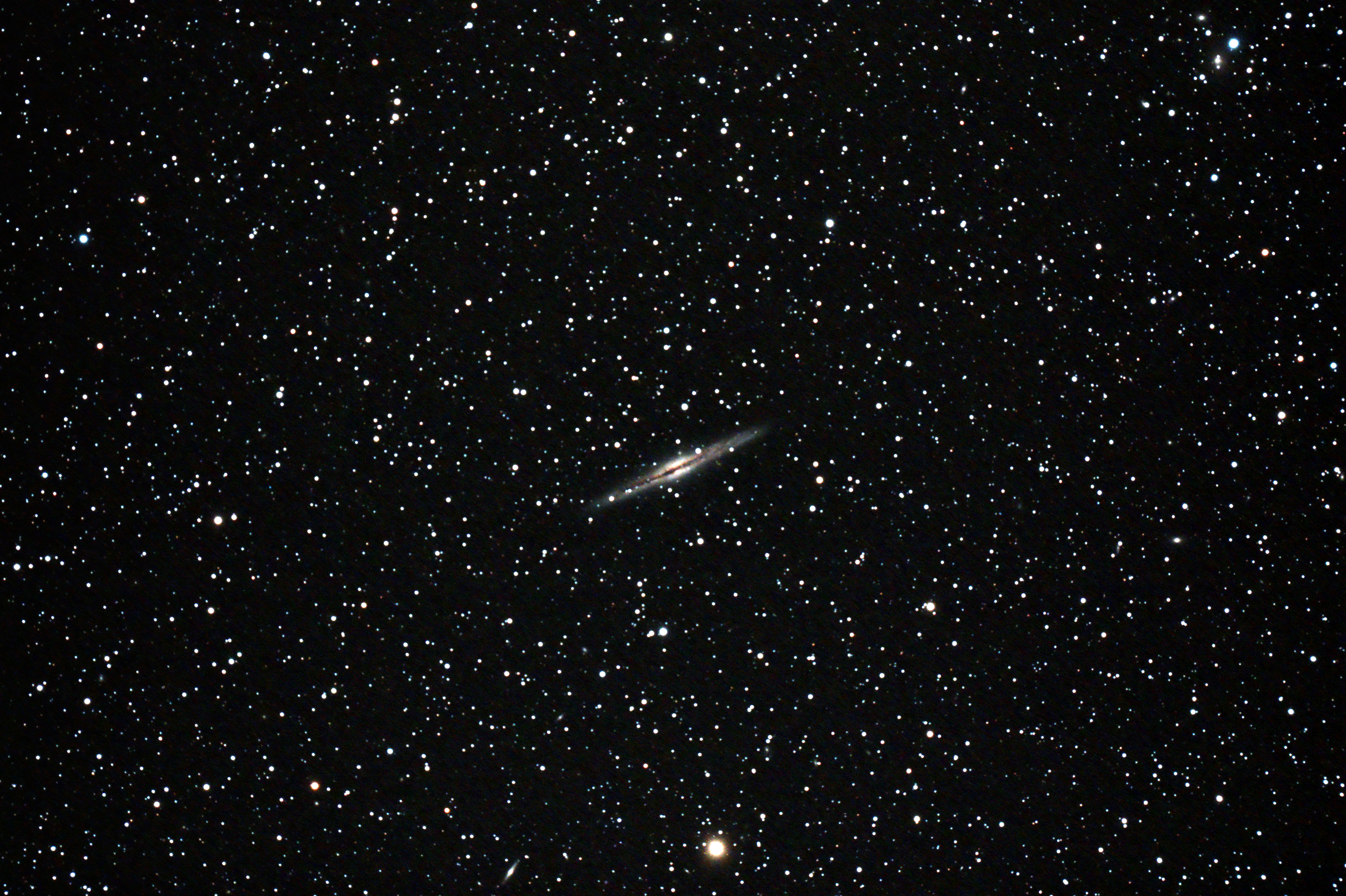 Die beliebte und bekannte Galaxie NGC 891 im Sternbild Andromeda zeigt sich in Kantenlage, ist 10,9 mag hell und wird mit ca. 40 Mio Lj Entfernung angegeben. Es gibt noch mehrere kleinere Galaxien im Bild, wobei am unteren Rand NGC 898 mit 13,9 mag und 240 Mio Lj am leichtesten auffällt.