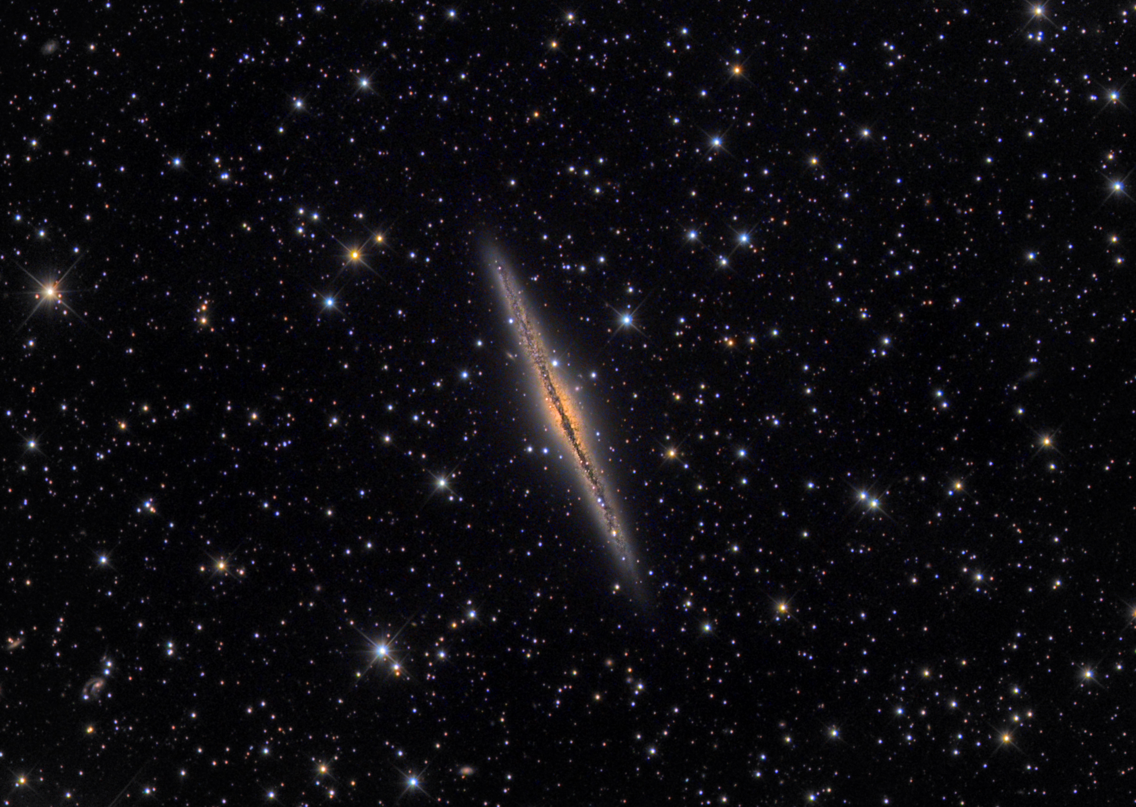 Unsere Milchstraße soll in 30 Milllionen Lichtjahren Entfernung ähnlich aussehen, wie NGC 891 – auch einer Spindel gleich, die durchzogen ist von einem Staubband. Etwa auf halber Entfernung zum Zentrum befindet sich die Sonne mit unserem Heimatplaneten...
