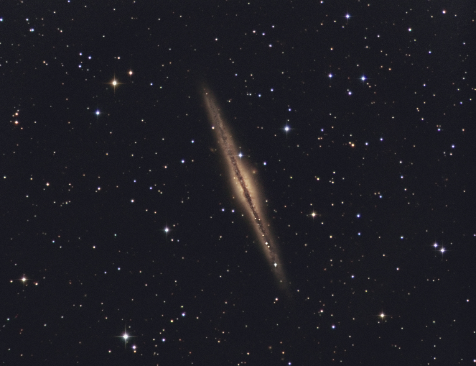 In all den vielen Jahren der Astrofotografie, habe ich mich immer wieder mal an NGC 891 versucht, jedoch nie so richtig Spaß an den Ergebnissen gefunden. Meines Ermessens nach auch gar kein so einfaches Objekt, sieht man mal von Übersichtsaufnahmen mit geringer Brennweite ab. Jetzt hat mich das Ergebnis doch überrascht, was sich unter dem Ruhrgebietshimmel bewerkstelligen läßt, rangeholt aus rund 30 Millionen Lichtjahren Entfernung.