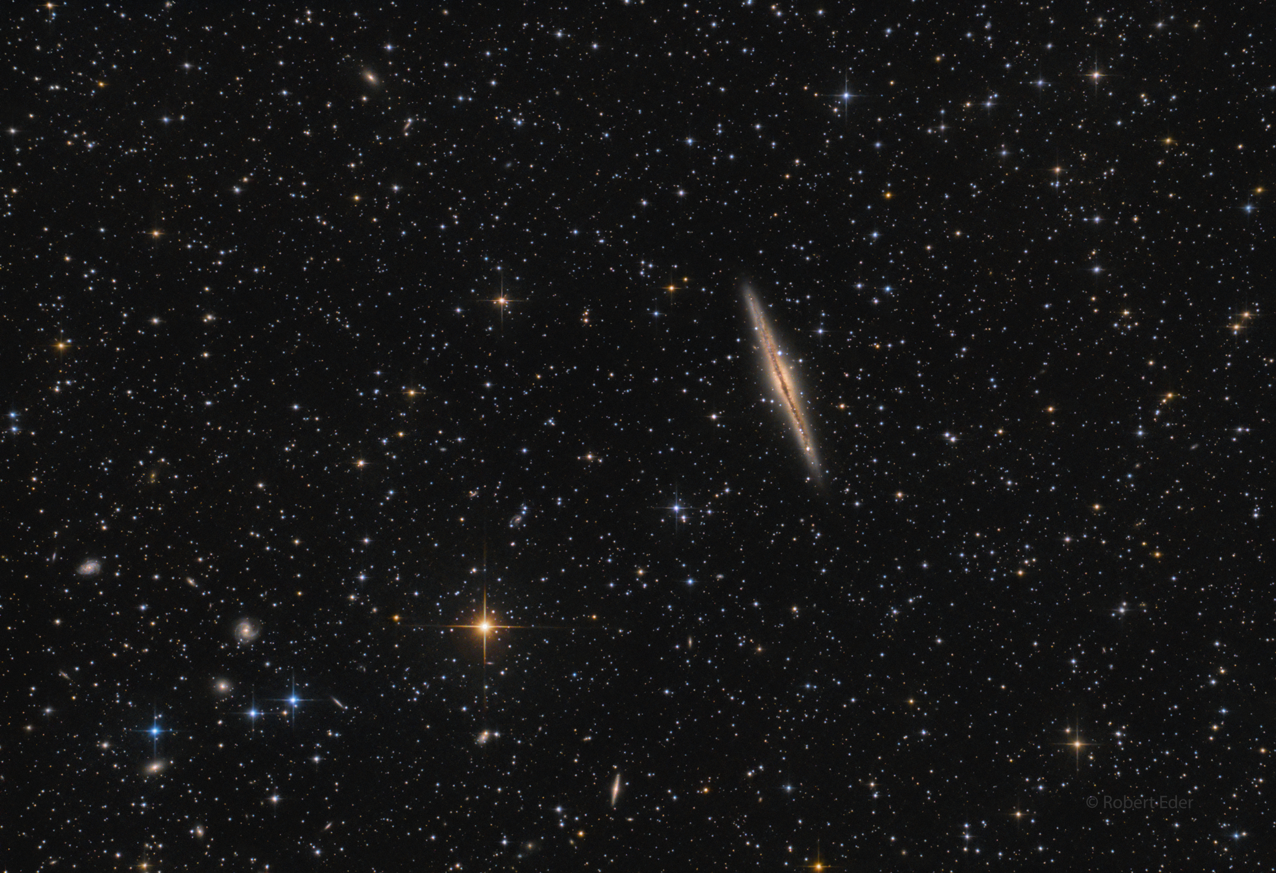 Im ersten Teil der Nacht habe ich mit meiner besseren Hälfte und Freunden die Planeten und die üblichen Vorführ-Objekte beobachtet. Den zweiten Teil benutzte ich, um NGC 891 aufzunehmen. Eine sehr schöne Edge-On-Galaxie im Sternbild Andromeda. Es wurde sehr kalt und extrem feucht. Als das Rohr im Zenit stand, musste ich die Heizung vom Guidescope voll aufdrehen, damit es nicht beschlägt. Ein sehr schönes Motiv mit dem Galaxienhaufen auf der linken Seite.